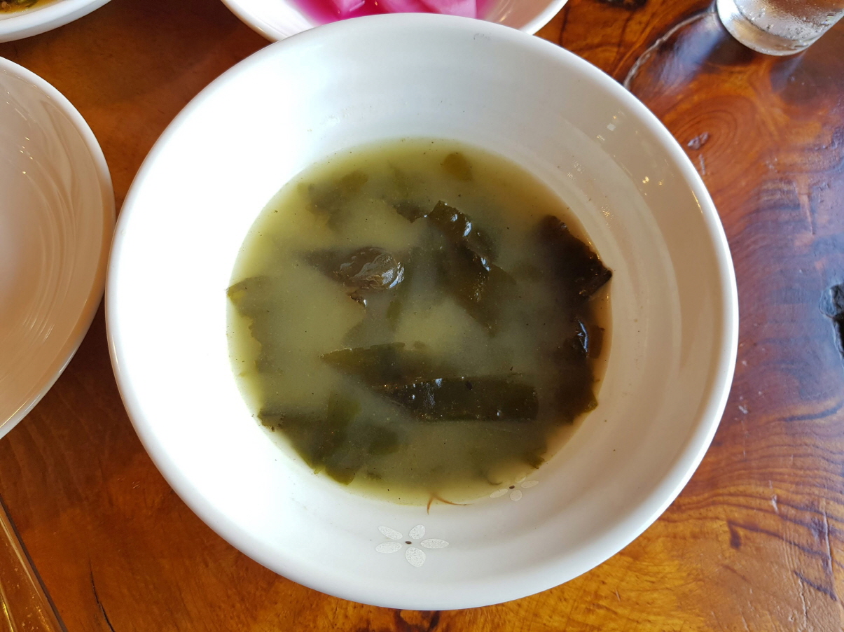 밑반찬과 같이 나온 미역국. 육수를 어떻게 내었는지 진하고 맛있다.