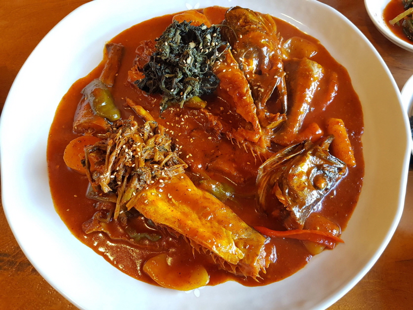 보기만해도 매워보이는 빨간 양념에 시래기와 곤드레가 들어가 있다. 코다리 살을 시래기나 곤드레와 같이 먹으면 더욱 맛있다.