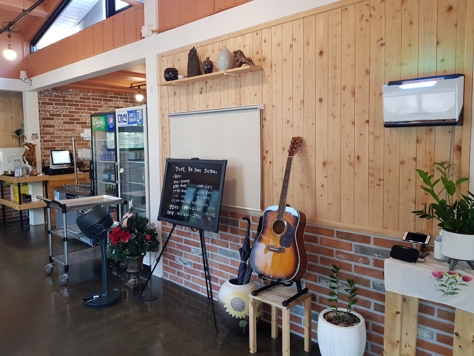 실내 벽 전체가 편백나무로 되어있었다. 그리고 곳곳에 놓여있는 화분과 통기타 같은 엔틱한 소품들이 있어 엔틱한 분위기도 감돈다.
