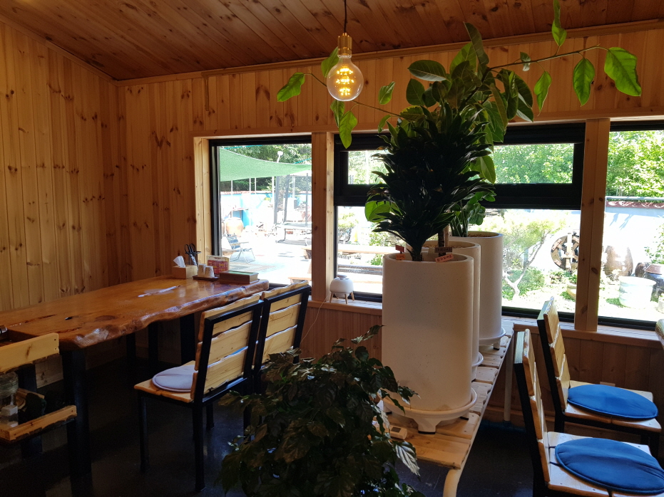실내 벽 전체가 편백나무로 되어있었다. 그리고 곳곳에 놓여있는 화분과 통기타 같은 엔틱한 소품들이 있어 엔틱한 분위기도 감돈다.