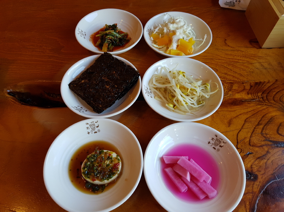정갈하고 깔끔하게 나온 6가지 반찬. 간이 과하지도 않고 전부 싱싱해서 먹기 좋았다.