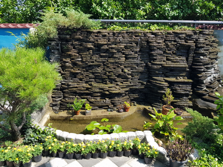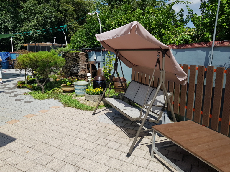 그리 넓지도 좁지도 않은 마당이 있었는데 이곳에는 그늘 의자와 트렘벌린, 야외 테이블 그리고 미니 호수가 있었다.
