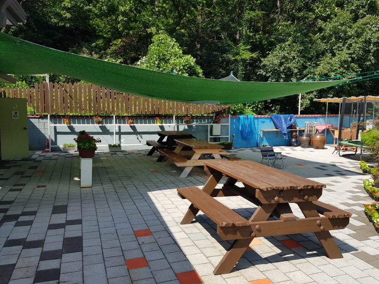 야외테이블과 그 옆에 있던 트램벌린. 봄, 가을에는 이곳 야외테이블에서 식사하면 작은 정원도 구경하고 아이들은 트렘벌린을 타고 놀 수 있어 좋을 듯 하다.