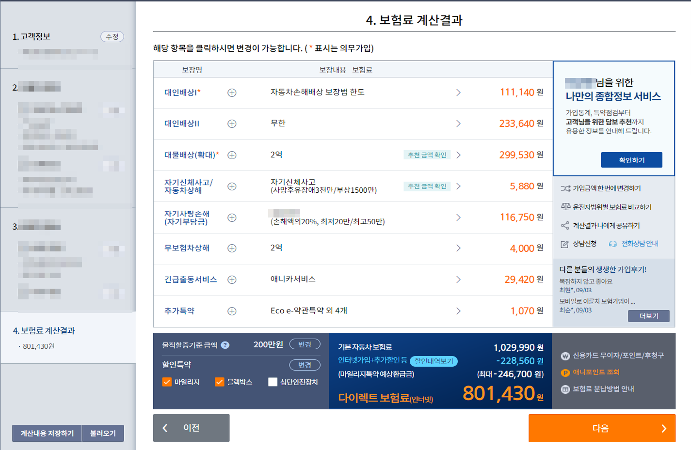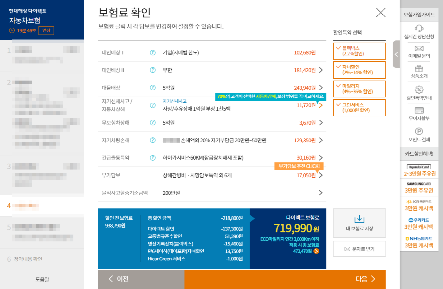 그리고 상담원을 붙들고 물어보지 않아도 되고 마음편하게 조건을 넣고 빼거나, 보장을 상향하거나 낮춰가며 조회해 볼 수 있는 것도 다이렉트를 선호하는 이유 중 하나이다.