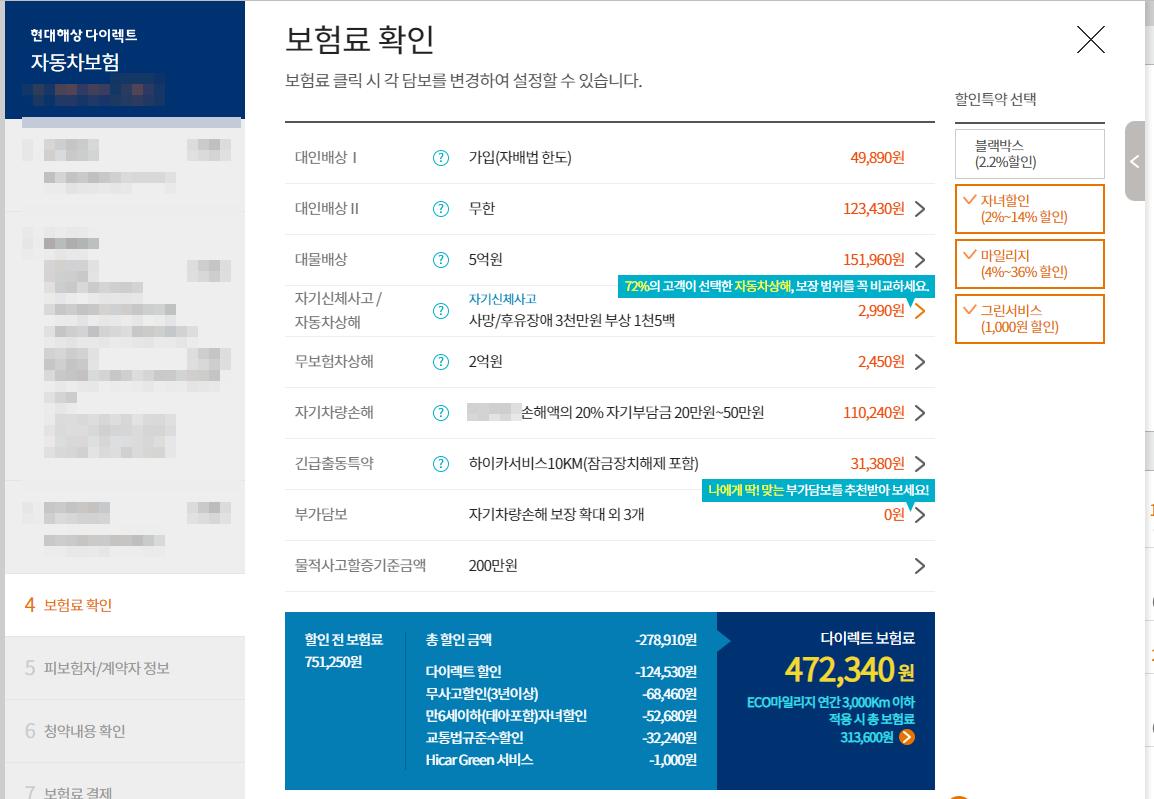 현대해상 보험료가 1만원 정도 비싼것으로 나왔다. 하지만 대물배상과 자기신체사고, 무보험차상해의 조건을 보면 현대해상 보장이 좋기에 같은 조건으로 다시 비교해 보기로 한다.