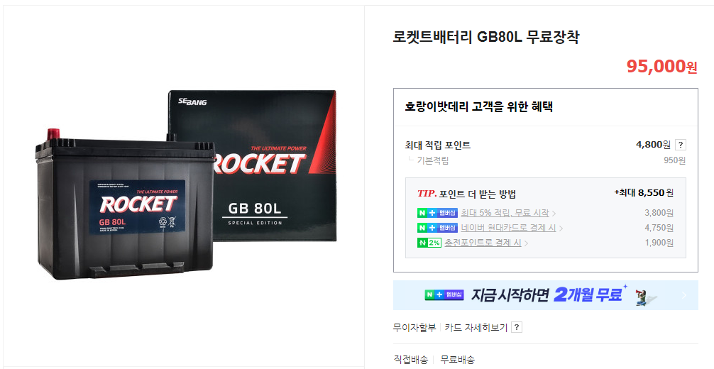 셀프교체가 어렵다면 장착까지 해주는 것을 찾아보면 되겠다. 배터리 용량 80L를 교체까지 받았을때 9만5천원이다. 이 요금은 지정된 업체로 가서 교체를 받는 요금이며 기사가 와서 교체해주면 3000원이 추가 된다. 그러면 9만8천원이다.