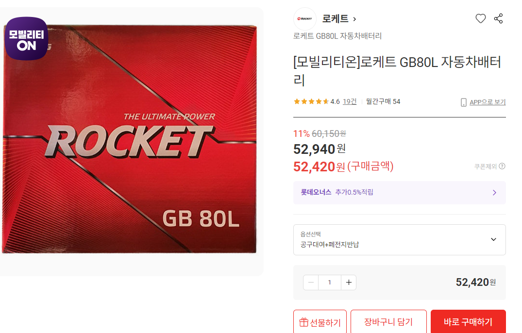 인터넷에서 가장 저렴했던 용량 80L 배터리 가격은 52,420원 이었다. (배송비1만원 별도, 배터리 반납조건) 배송비 1만원이 별도이므로 6만3천원 정도 하는 셈이다. 시간적 여유가 있을때 주문해 셀프로 교체하면 저렴하게 교체할 수 있겠다.