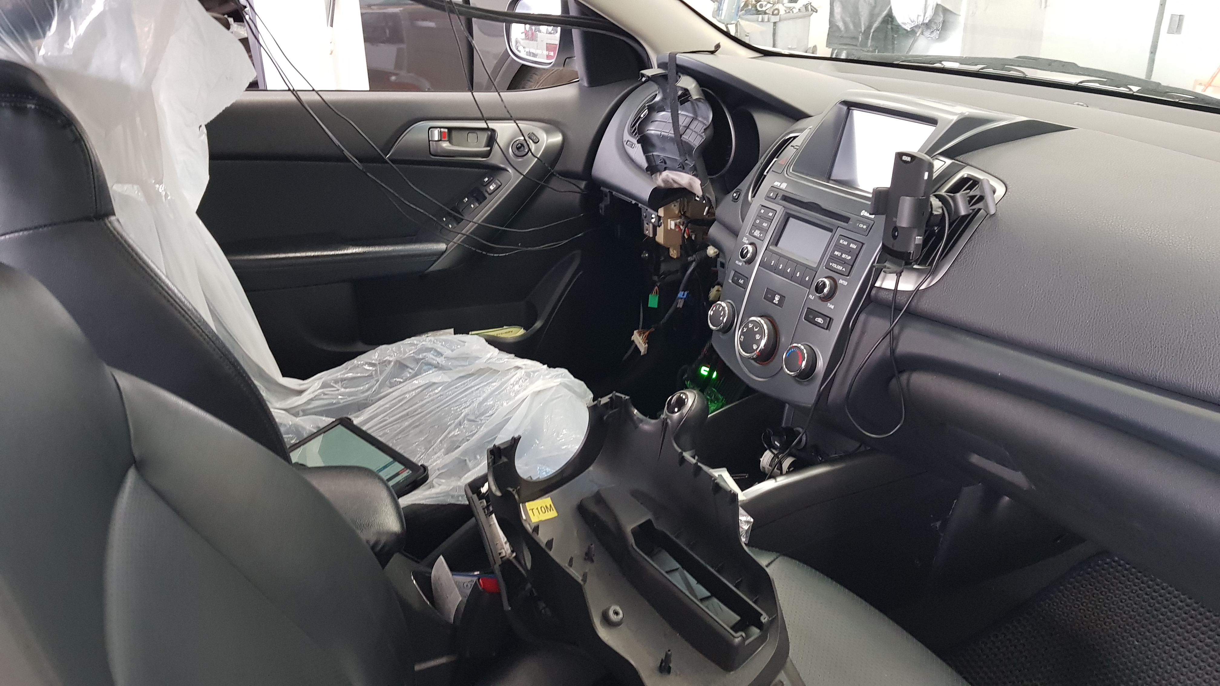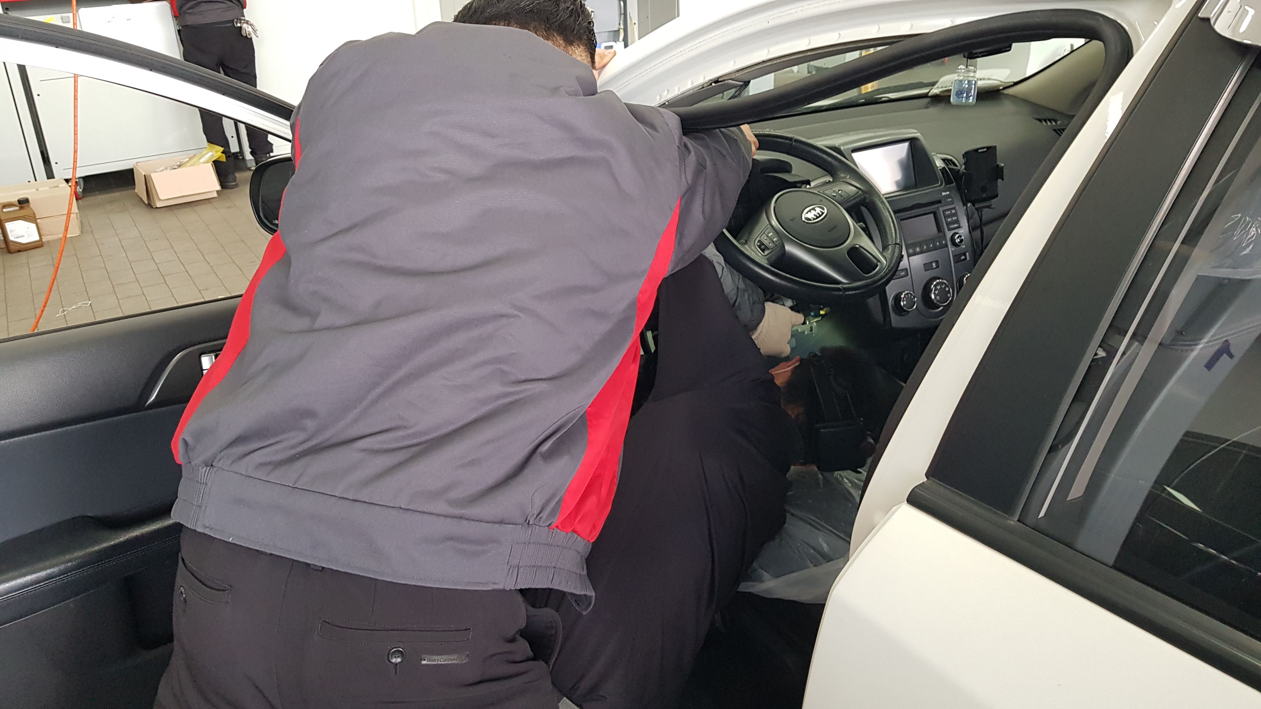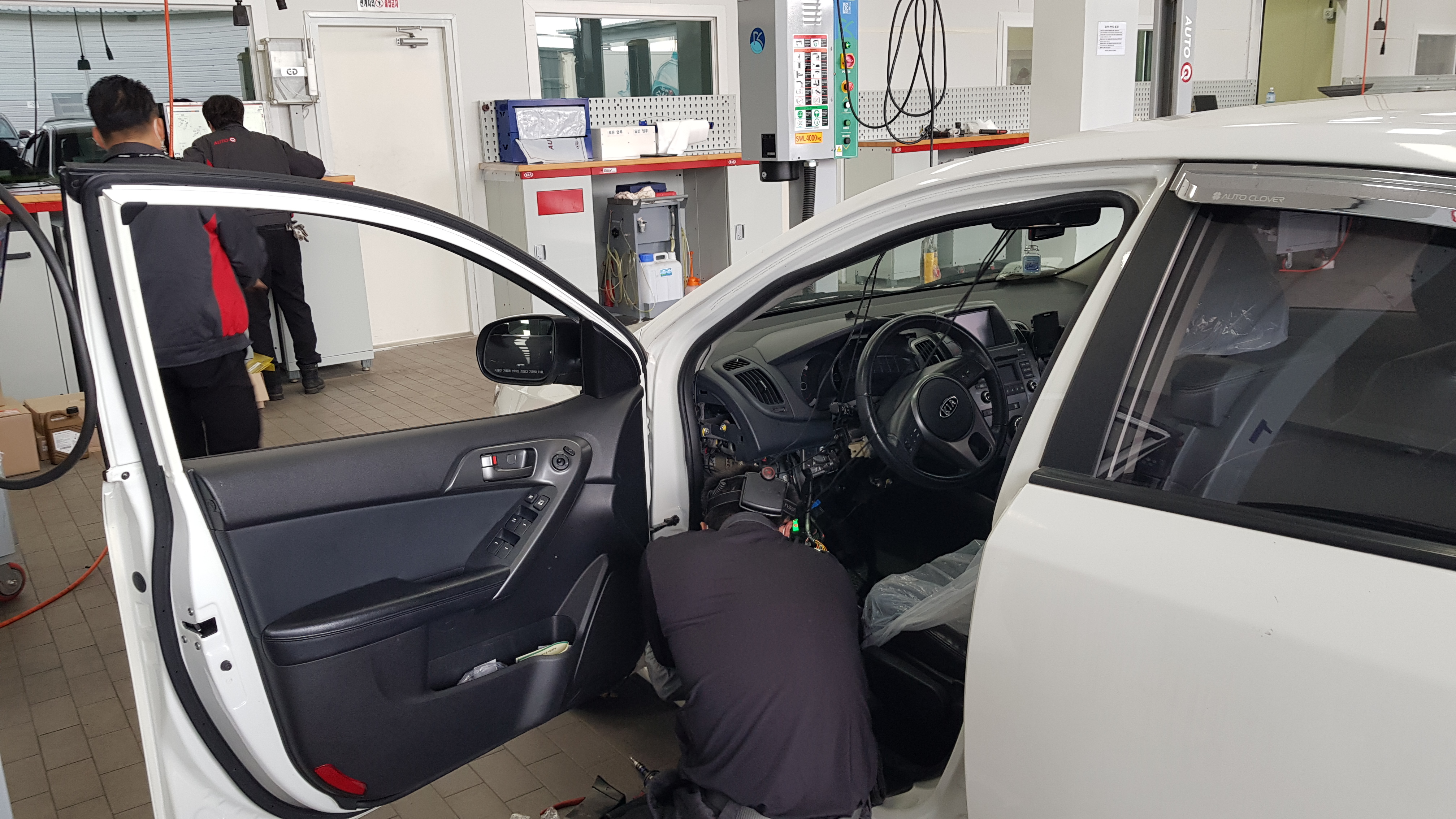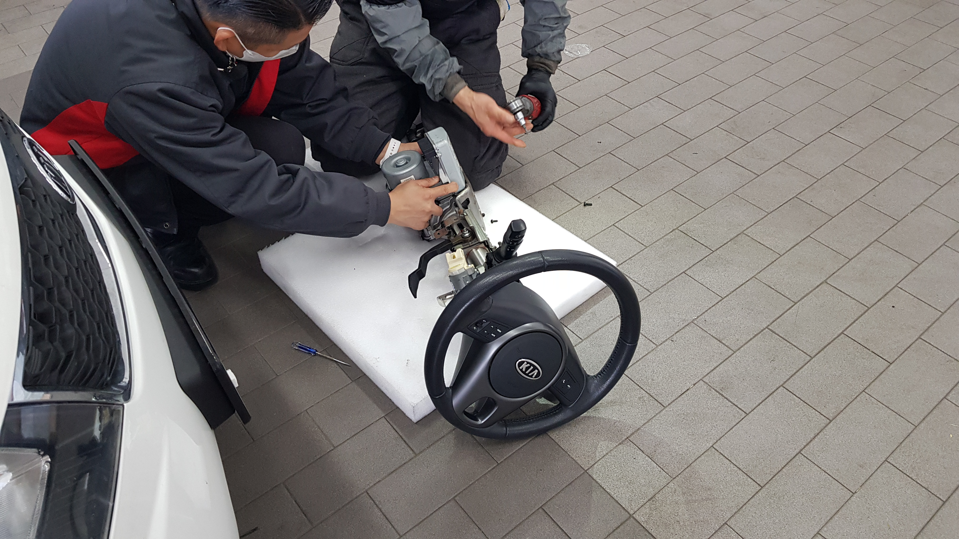 앞쪽으로 가보니 이렇게 핸들을 뽑아서 교체작업을 하고 있는 중이었다. 작은 부품이라 부품가격은 얼마안하지만 시간도 많이들고 어려운 작업이라 공임비가 비쌀것 같았다.