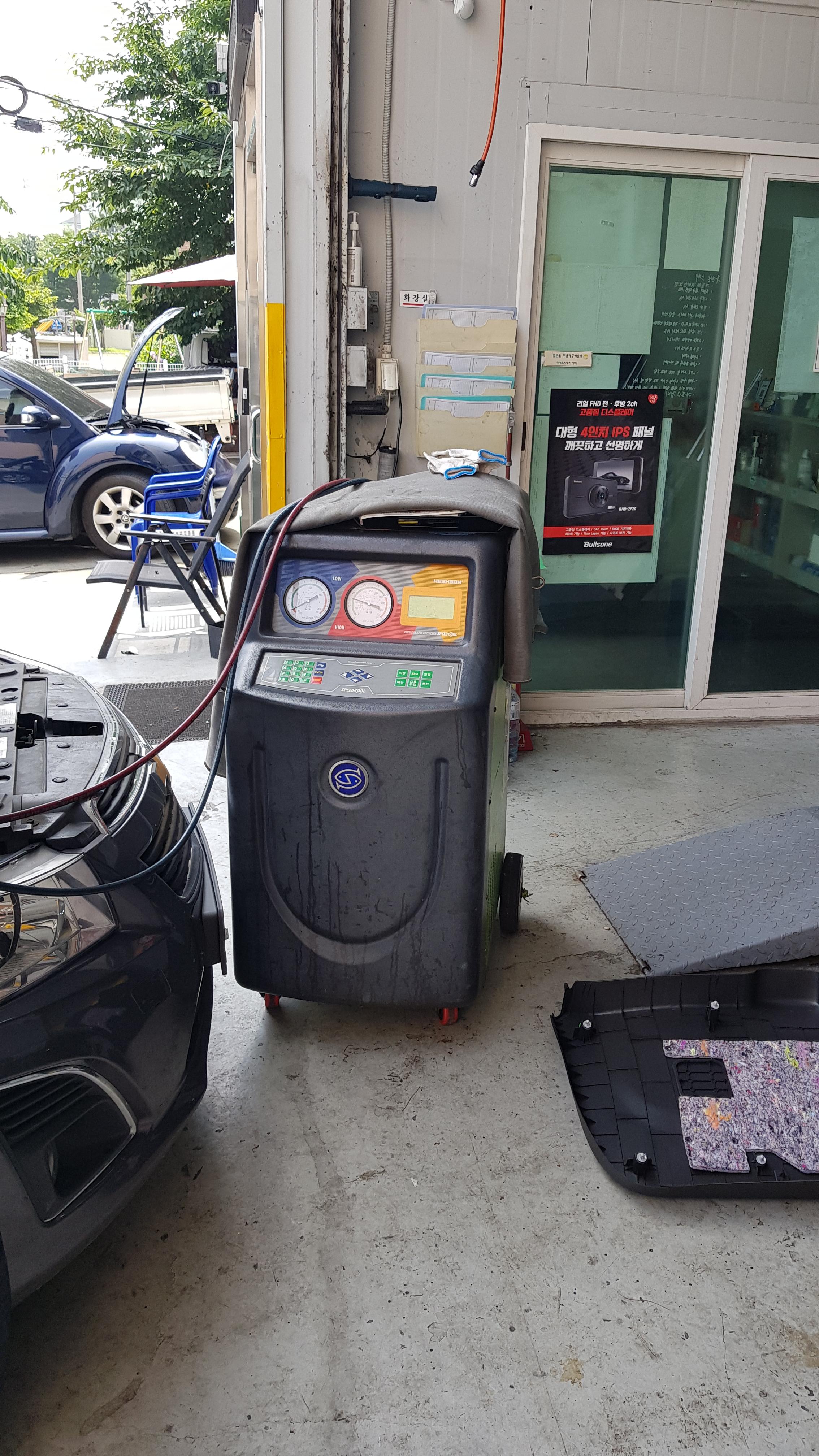 에어컨 고장 원인에는 1. 에어컨 가스부족(냉매부족) 2. 밸브파손으로 인한 가스 누출, 3. 콤프레샤 고장 이렇게 3가지 주요원인이 있다고 한다. 일부러 번호를 매겨놓았다. 자동차 에어컨 고장시 보통 저 순서대로 점검을 진행한다. 위 사진에서 웃고 있는 모양의 바퀴달린 기계는 에어컨 냉매를 체크해주는 기계이다.