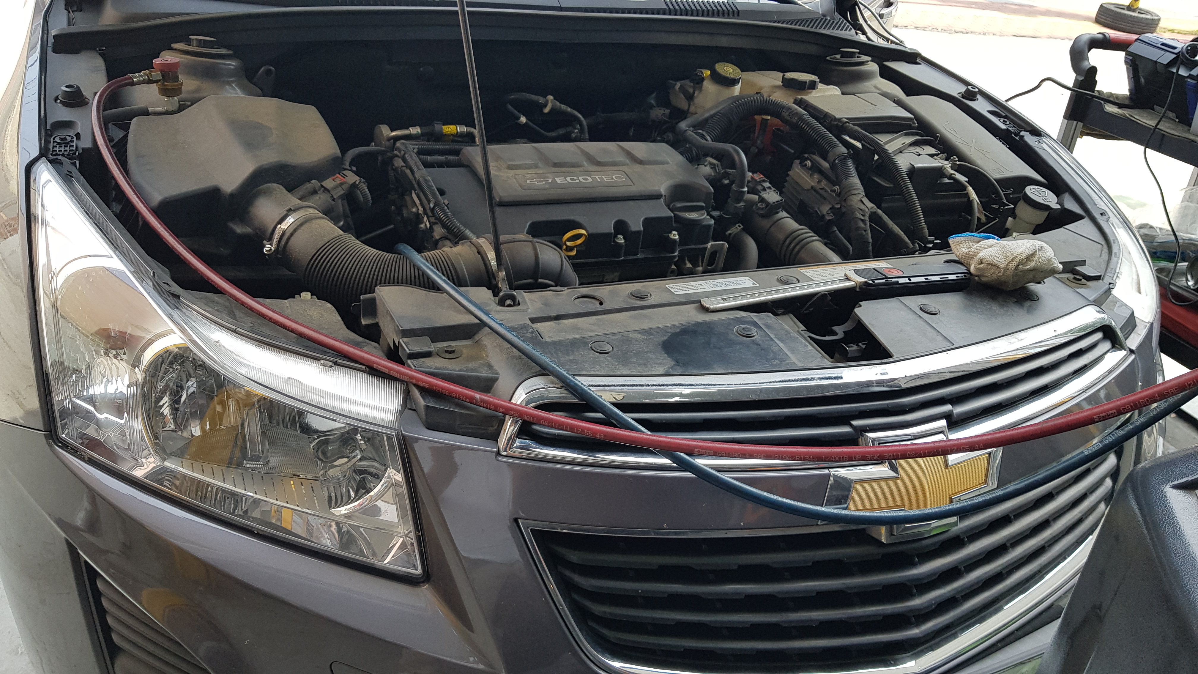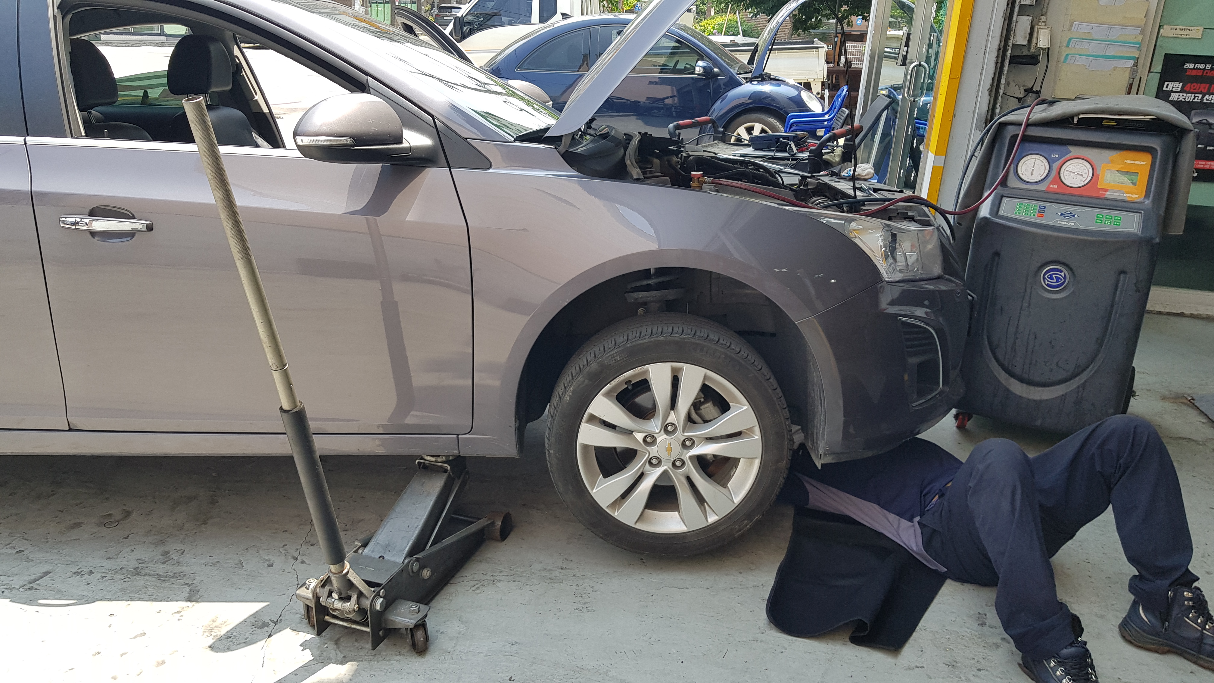 필자의 차량은 2014년식 쉐보레 크루즈이다. 정비소에가서 에어컨에 찬바람이 안나온다고 증상을 설명하고 점검을 요청하니 정비소 사장님이 바로 나와서 봐주신다.
