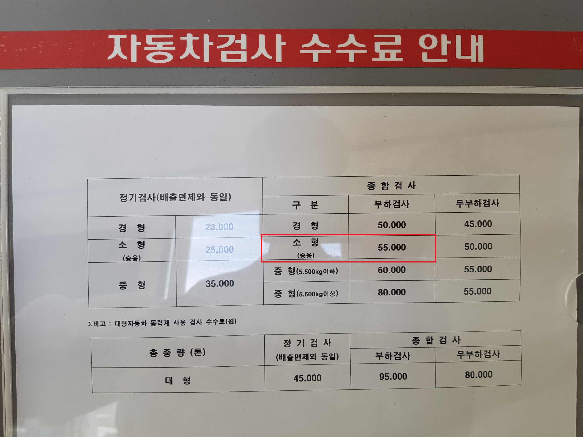 이번에 방문했던 사설 검사소와 교통안전공단 출장검사소의 종합 검사 수수료 차이는 단돈 천 원이었다. 사설 검사소의 검사 비용/수수료는 업체마다 다르므로 방문 전 전화로 문의해 보는 것이 좋겠다.
