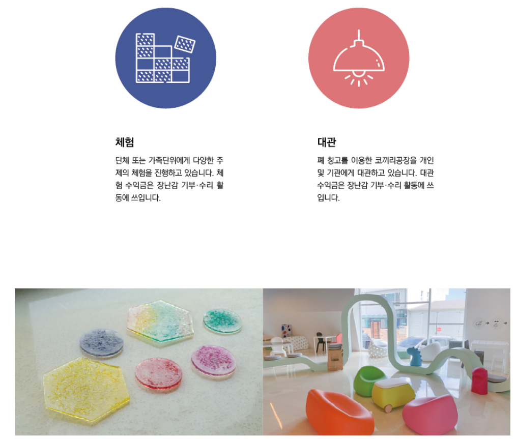 강아지와 산책하다 발견한 코끼리공장. 건물 색깔이 눈에 띄었고 이름도 특이해서 가까이 가서 자세히 보았다. 내부에 불이 켜져있었고 문이 열려있어 안으로 들어가 보았다. 설명을 들어보니 이곳 코끼리 공장에서는 버려지거나 기부받은 장난감을 수리해서 취약계층 아이들에게 나누어주는 장난감 순환활동을 하고 있는 곳이다. 이렇게 나눔과 순환 그리고 환경 보호라는 세가지의 사회적 가치를 위해 노력하고 있는 곳이었다.