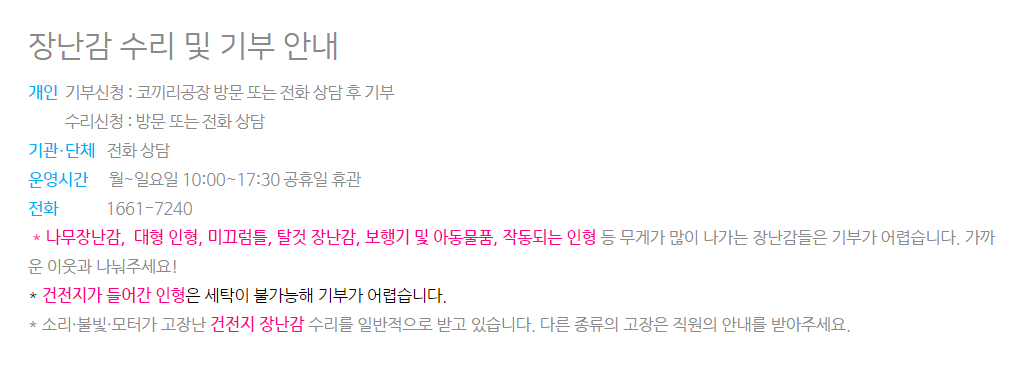 코끼리 공장에서 기부가 안되는 장난감과 수리가 안되는 장난감이 있으니 위에서 참고 후 기부 및 수리를 하는 것이 좋겠다.