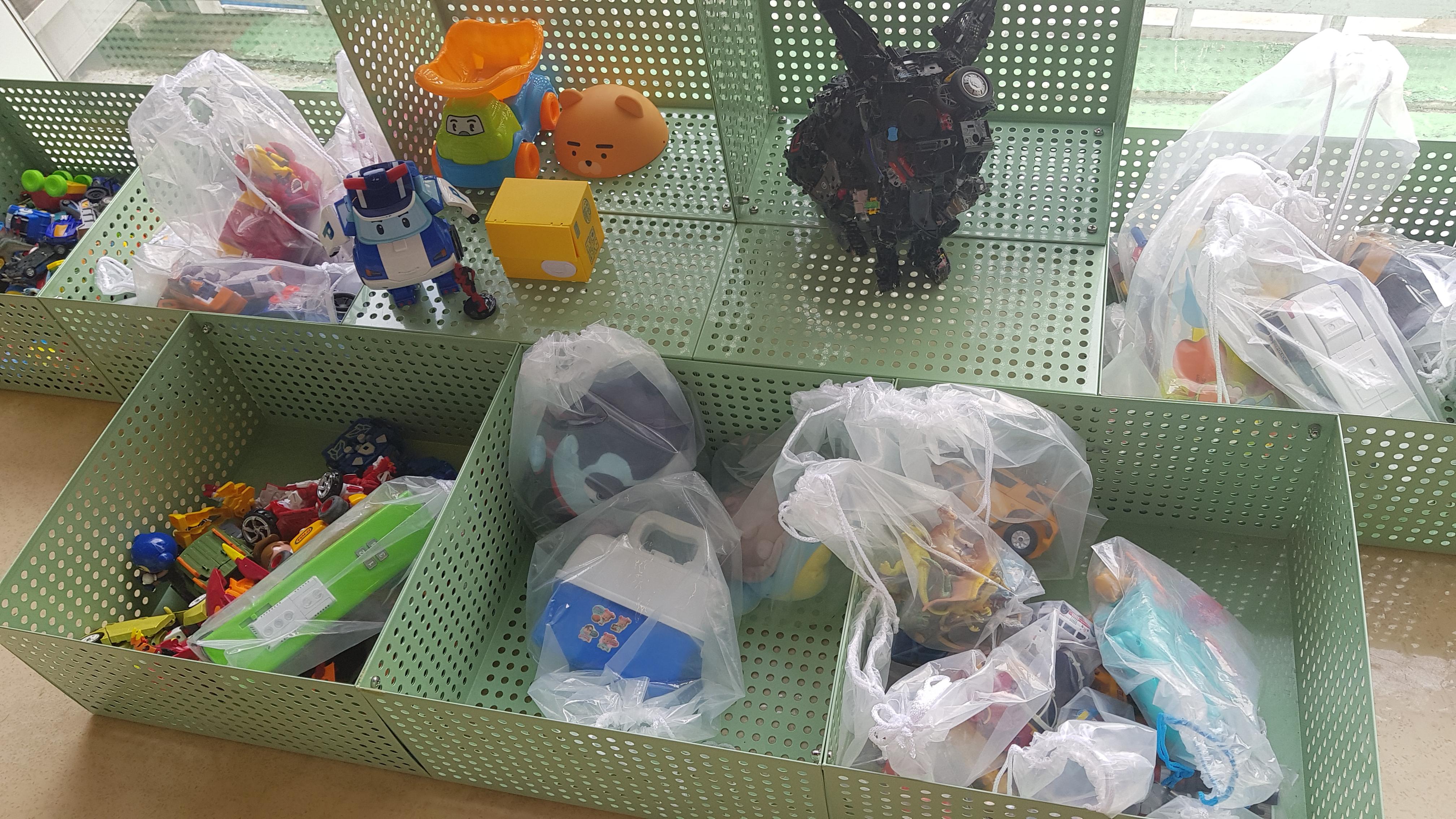 안내해주시는 분이 안쪽으로 안내해주며 장난감을 하나 골라서 가도 된다고 한다. 이 장난감은 코끼리공장에서 기부 받아 수리하고 소독한 장난감이다.