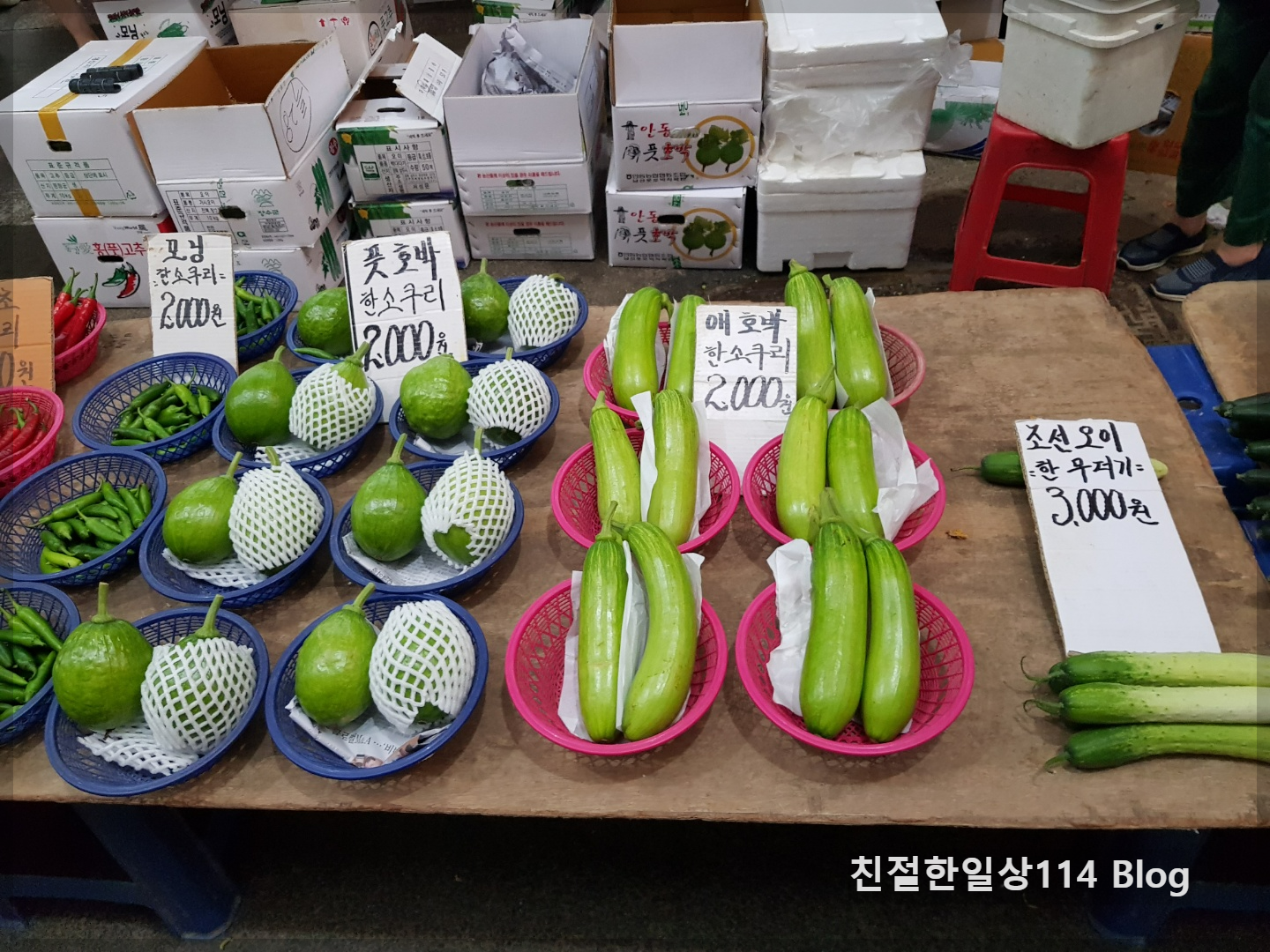 재래시장 야채 가격. 애호박은 1개에 1000원씩이다. 개당 가격으로 따지면 야채는 정말 싸다.
