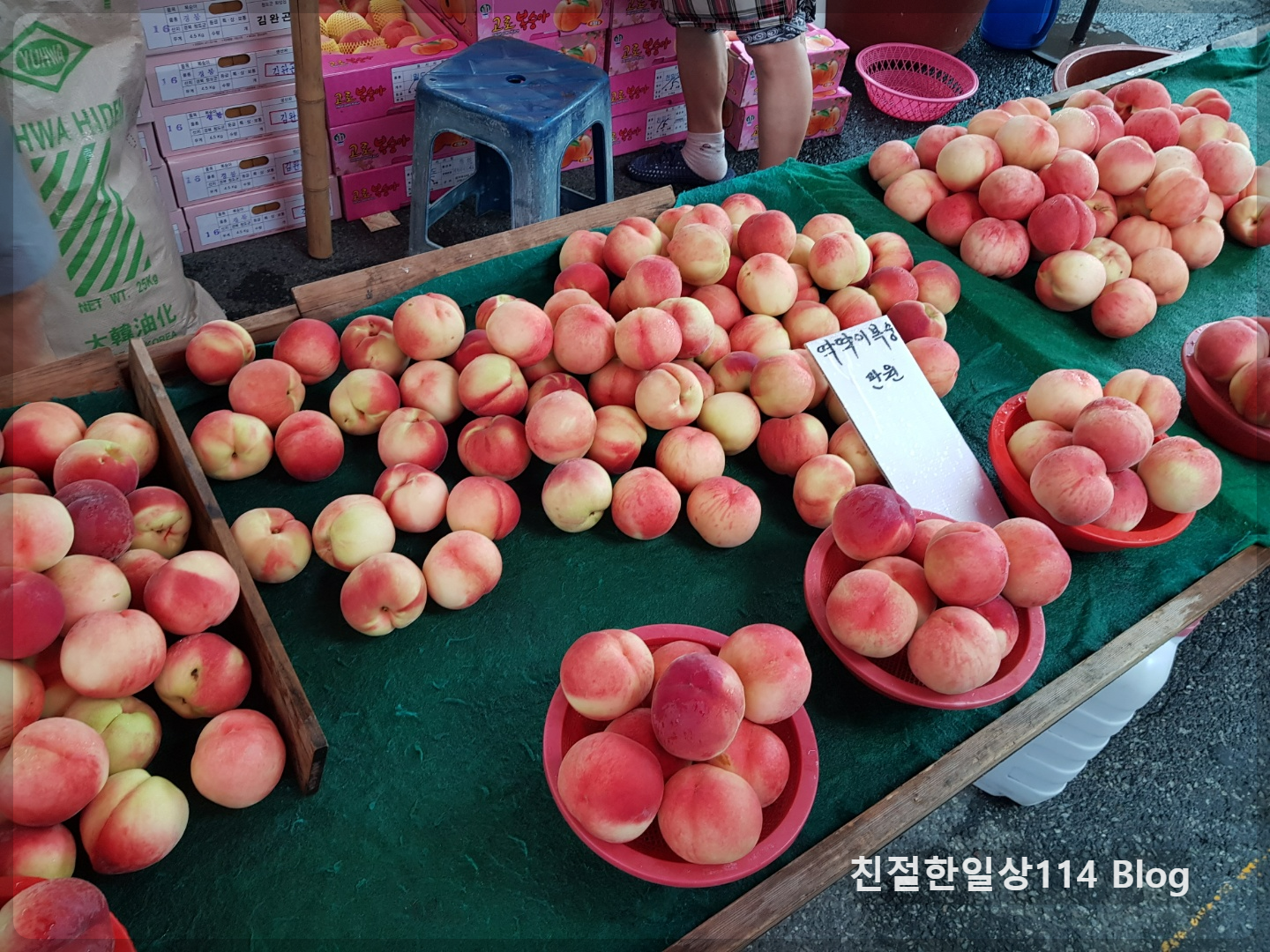 딱딱이 복숭아라고 써붙여놓은 복숭아도 한소쿠리 만원씩인데 백도보다는 1개씩 더 담겨있다. 갯수는 1개가 더 많지만 백도의 크기가 더 크다. 당도는 두 종류 같다고해서 딱딱이 복숭아로 산다.