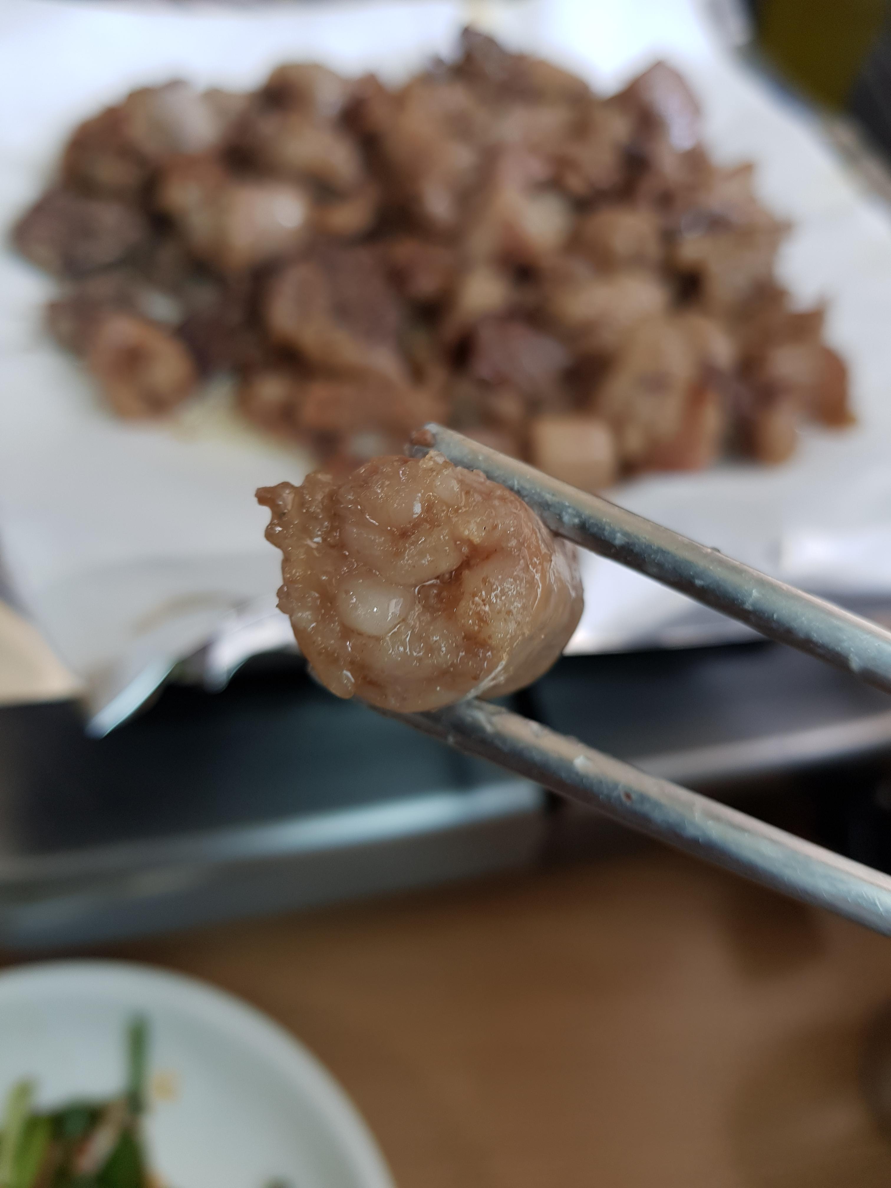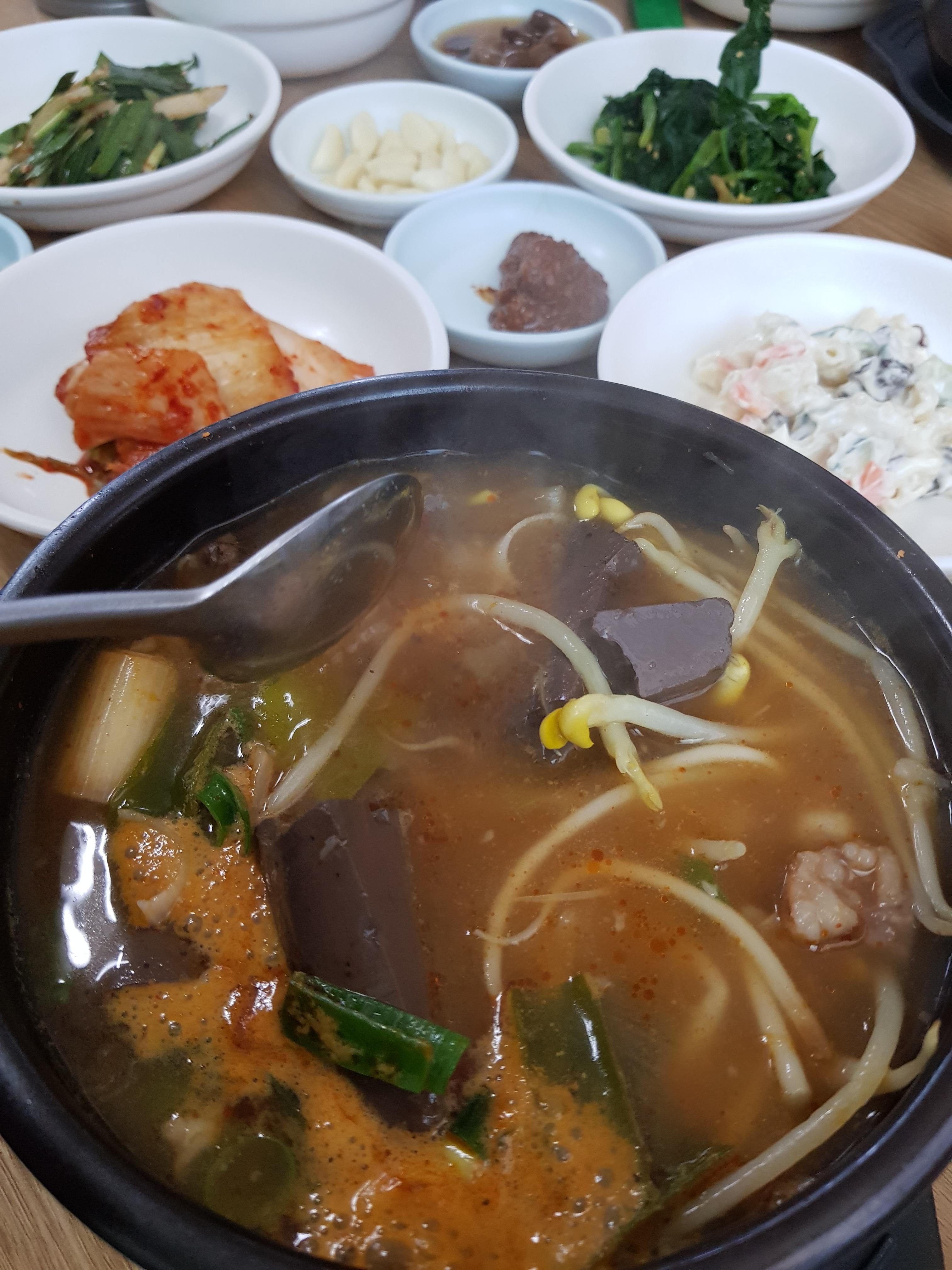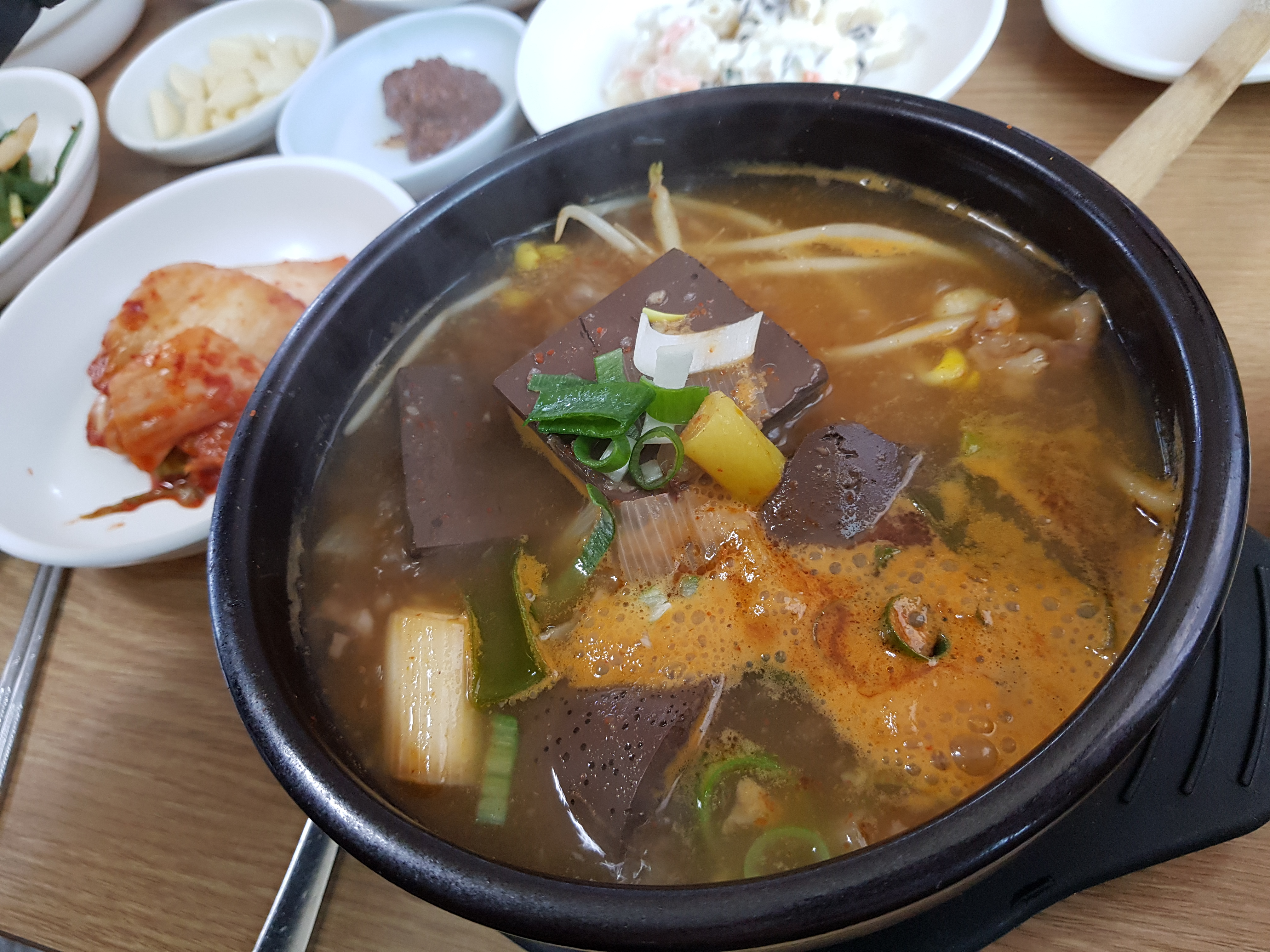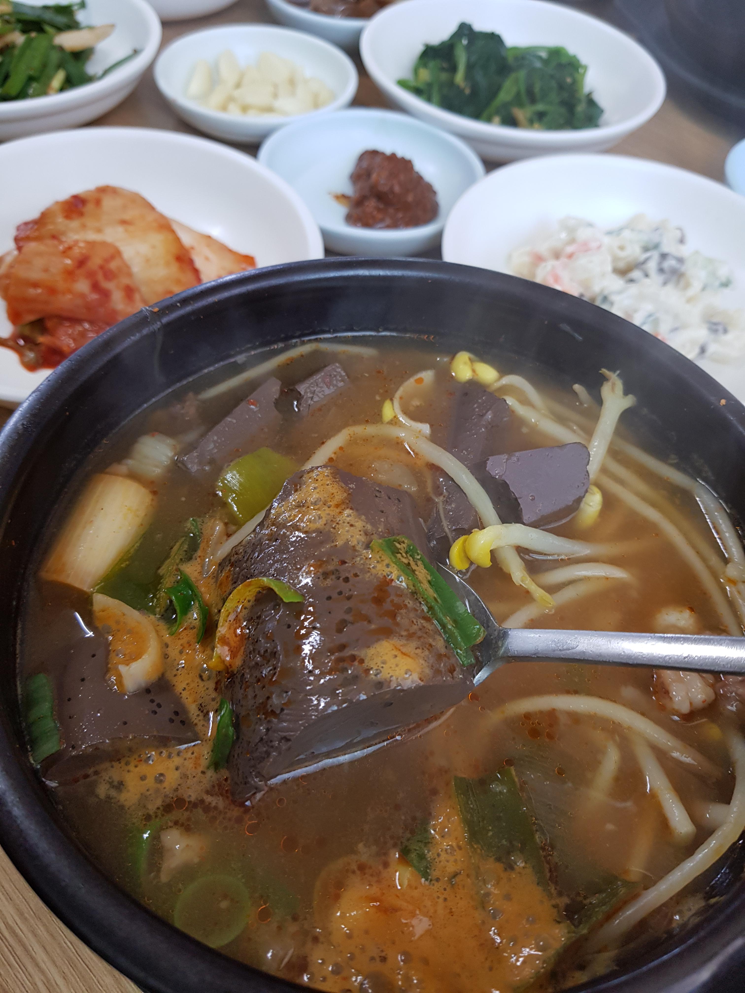 막 나온 선지국를 한번 휘 저어 선지를 한숟깔 떠본다. 두툼한 선지에서 김이 모락모락 올라오고 있다.
