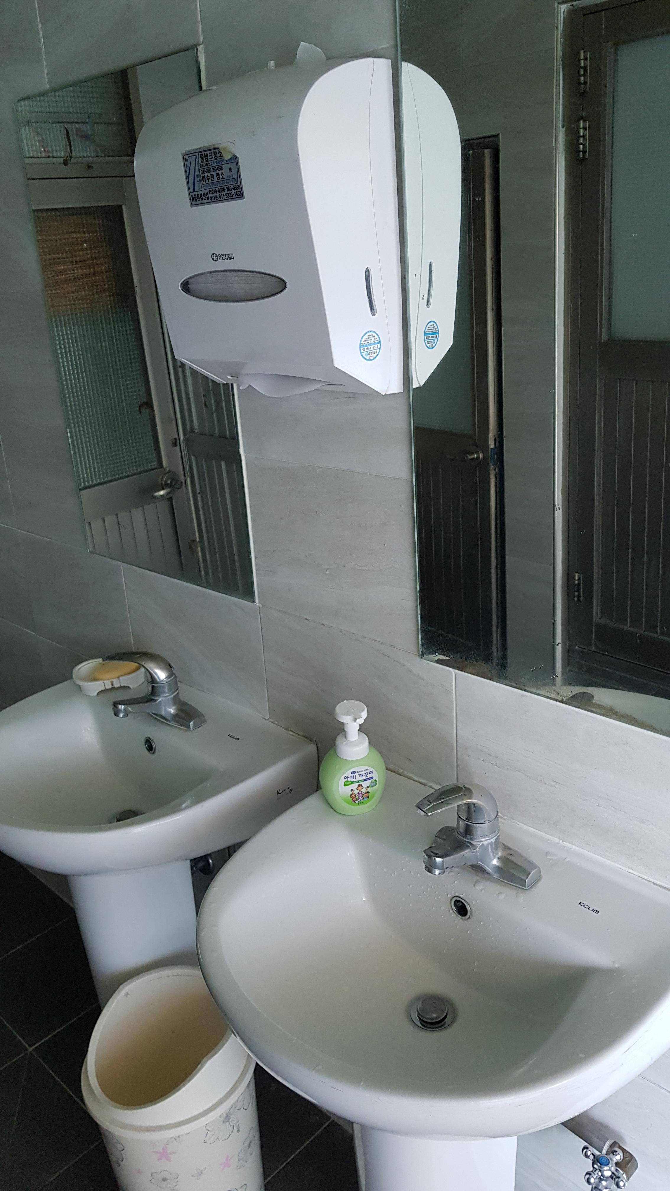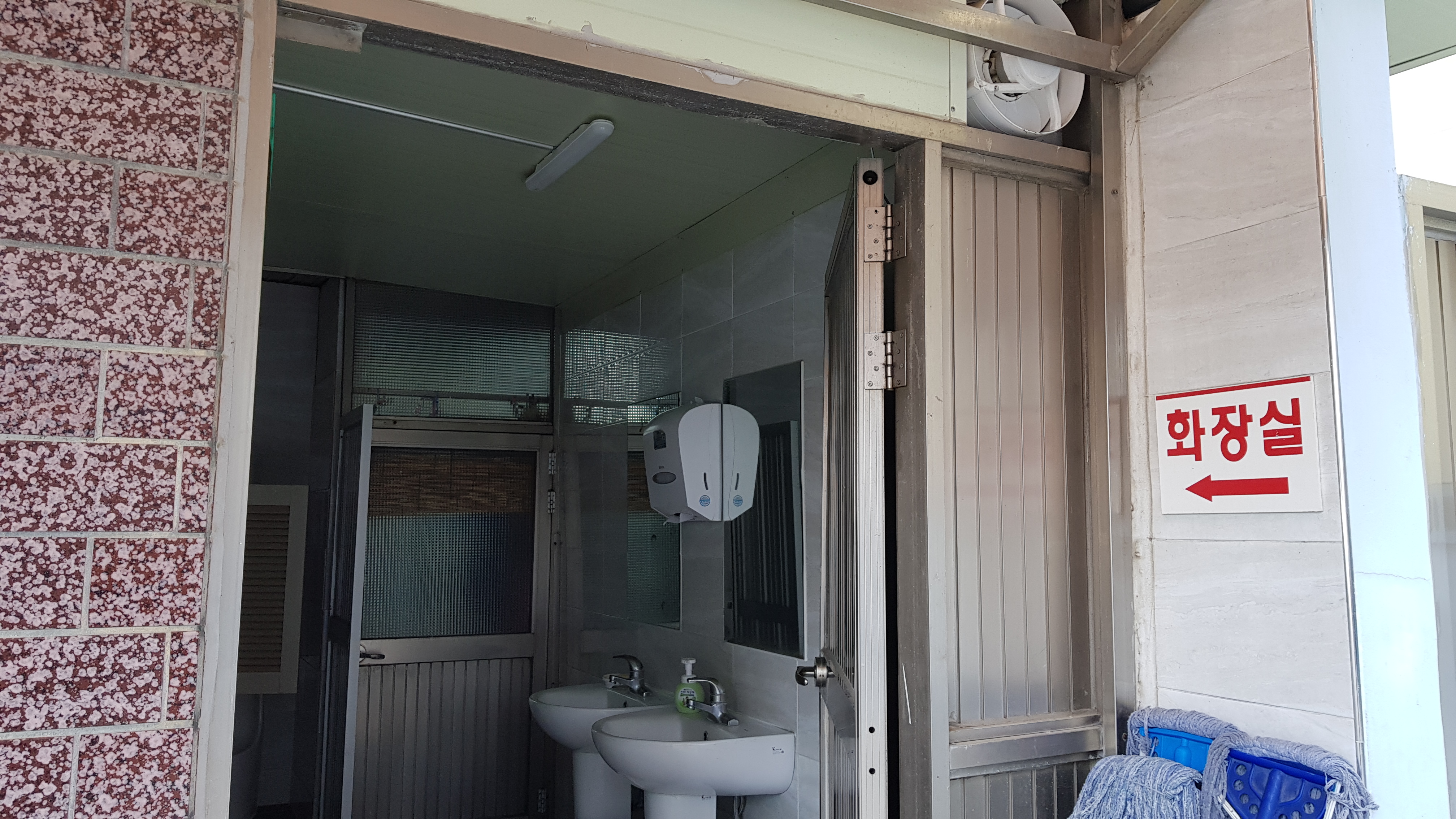 세면대는 2개에 손세정제와 물닦이 티슈가 있어서 용변후 깔끔하게 씻고 나올 수 있다.