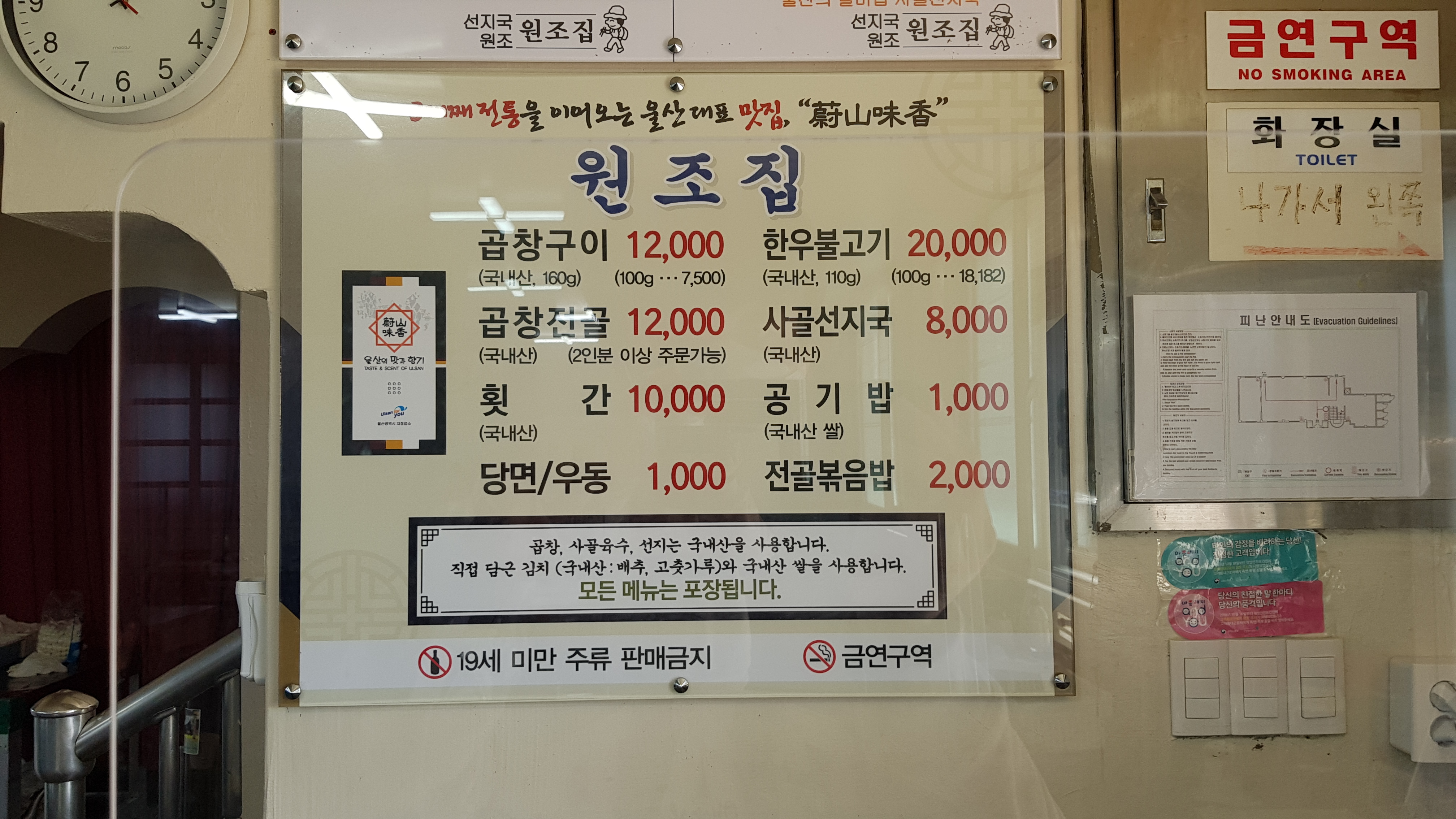 울산에서 곱창이 생각날때면 무거동으로 간다. 무거동에 삼호곱창골목이라는 거리명칭이 따로 있을정도로 오래되고 맛있는 곱창집들이 많이 있다. 곱창은 기가 약한 사람에게 기를 보충해주는 효과가 있다고하여 산후조리에도 먹는다고 하며 고담백, 저 칼로리 식품으로 위벽 보호와 알콜 분해 작용도 뛰어나다고 한다. 그래서인지 곱창은 오래전부터 술안주로 사랑 받아왔는가 보다. 필자도 곱창을 먹을때면 술이 생각난다. 하지만 운전을 책임져야하기에 이번에는 위벽 보호만 하는걸로 만족해야 했다. 무거동 곱창 맛집중에 이번에도 얼마전에 방문했던 원조집에 들렸는데 그때는 자글자글한 국물이 생각나 곱창전골을 먹었었다. 원조집에 갈때면 항상 먹는 메뉴가 곱창구이에 선지국을 같이 시켜서 먹는다. 이번에는 즐겨먹던 곱창구이와 선지국을 주문해서 먹었고 사진으로 남겨보고자 한다. (원조집의 곱창전골이 궁금하다면 아래쪽으로 내려가 이전 포스팅 링크 참고)