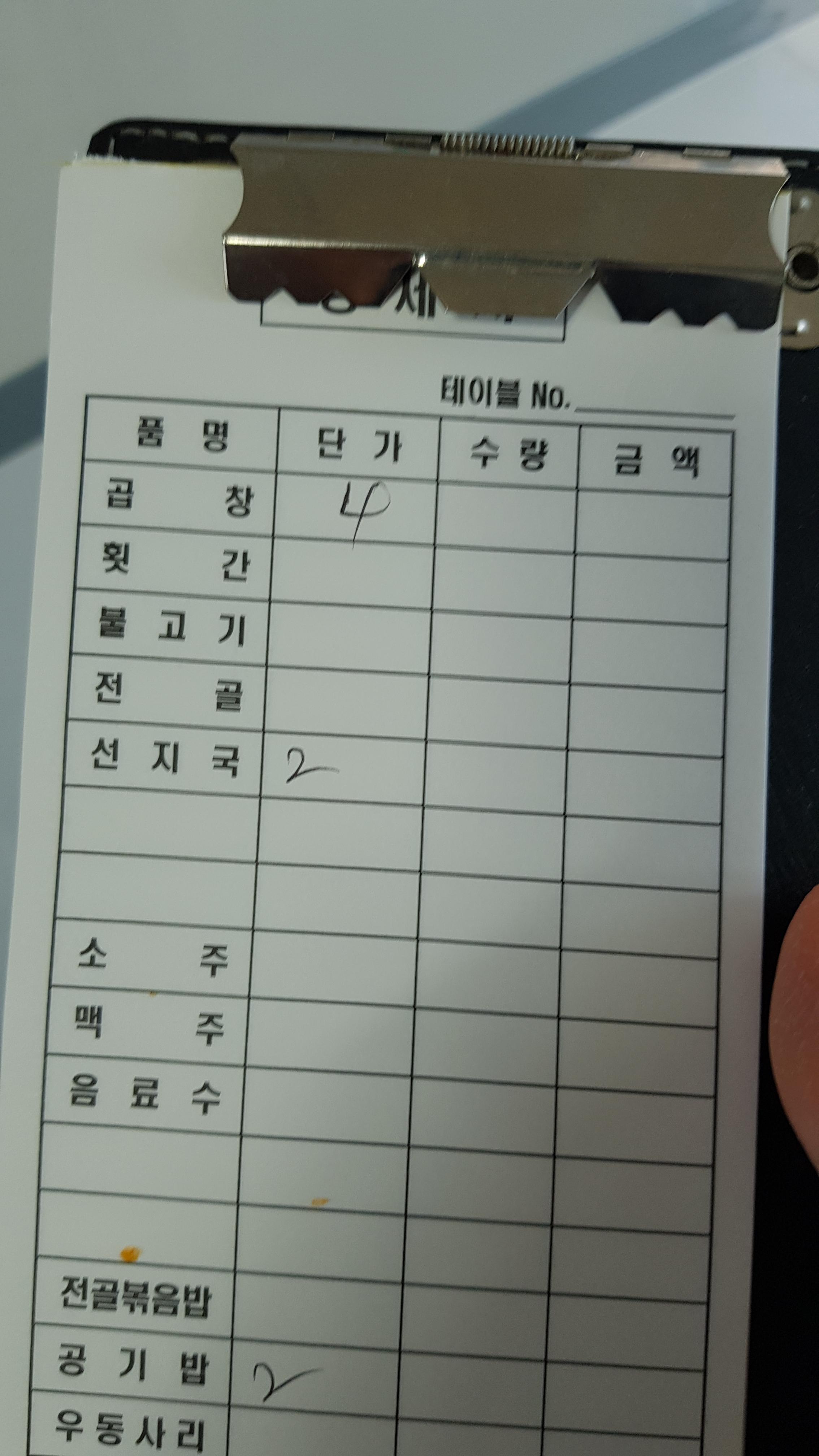 메뉴판은 따로 주지 않는다. 카운터 뒷쪽에 걸려있는 메뉴판을 보고 주문하면 된다. 이번에는 곱창구이 4인분, 사골선지국 2개, 공기밥 2개를 주문한다. 선지국에 공기밥이 포함되어있어 공기밥은 2개를 추가 주문 했다. 소주나 맥주를 함께하면 좋겠지만 운전관계로 대신 논알콜의 사이다를 주문한다.