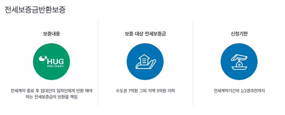 전세계약 종료 시 임대인이 임차인에게 반환해야 하는 전세보증금의 반환을 책임지는 보증상품으로 HUG(주택도시보증공사)에서 신청할 수 있다.