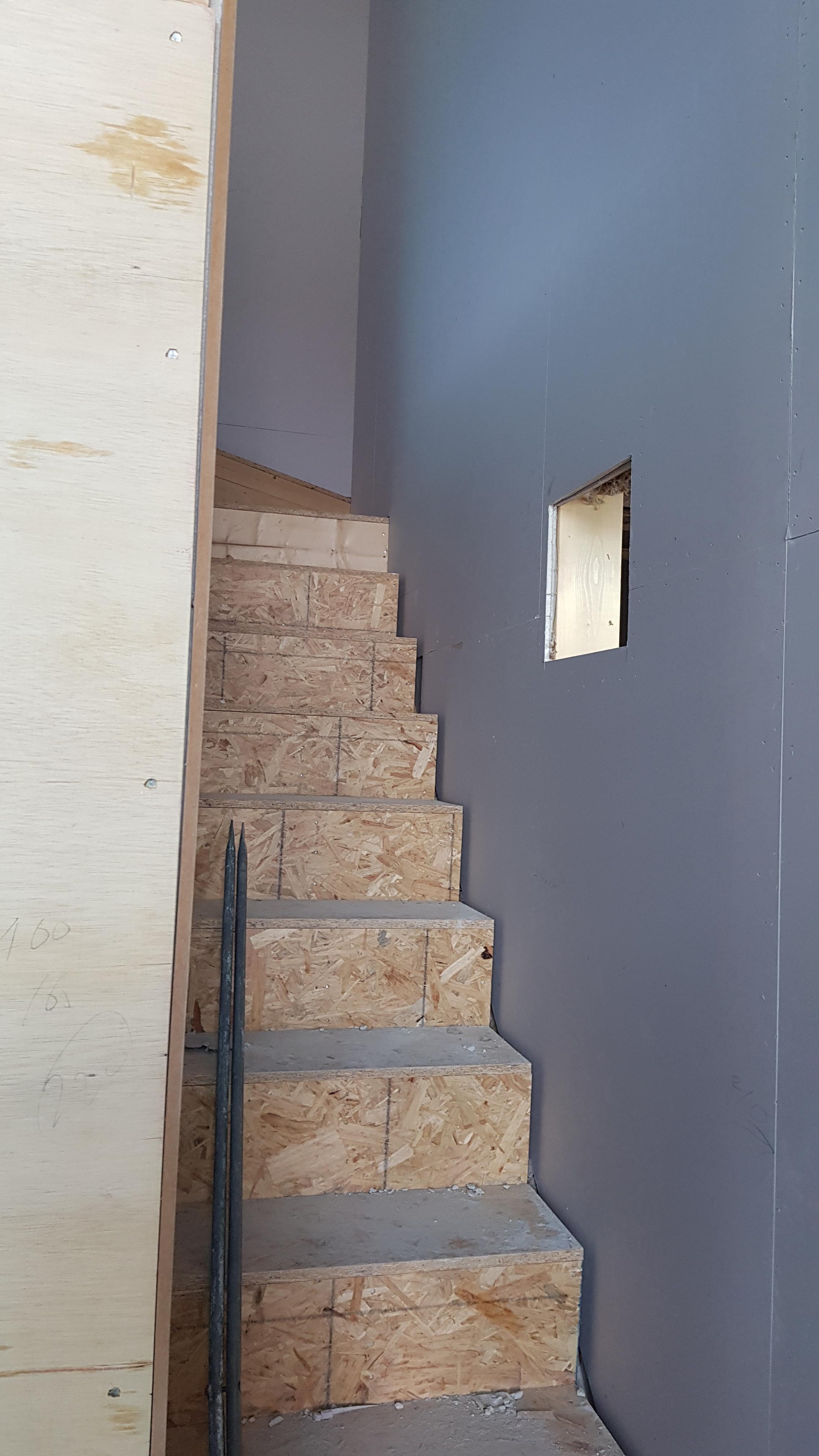 이런 계단이 완성이 되었다. 왼쪽 사진은 계단 손잡이(손스침)를 만들기 전이고 오른쪽은 손잡이를 만들고 나서 사진이다. 조금 자세히 보면 계단 오른쪽으로 작은 창문이 하나 보인다. 계단실 중간정도에 창문모양의 매립형 수납장을 만들었다.