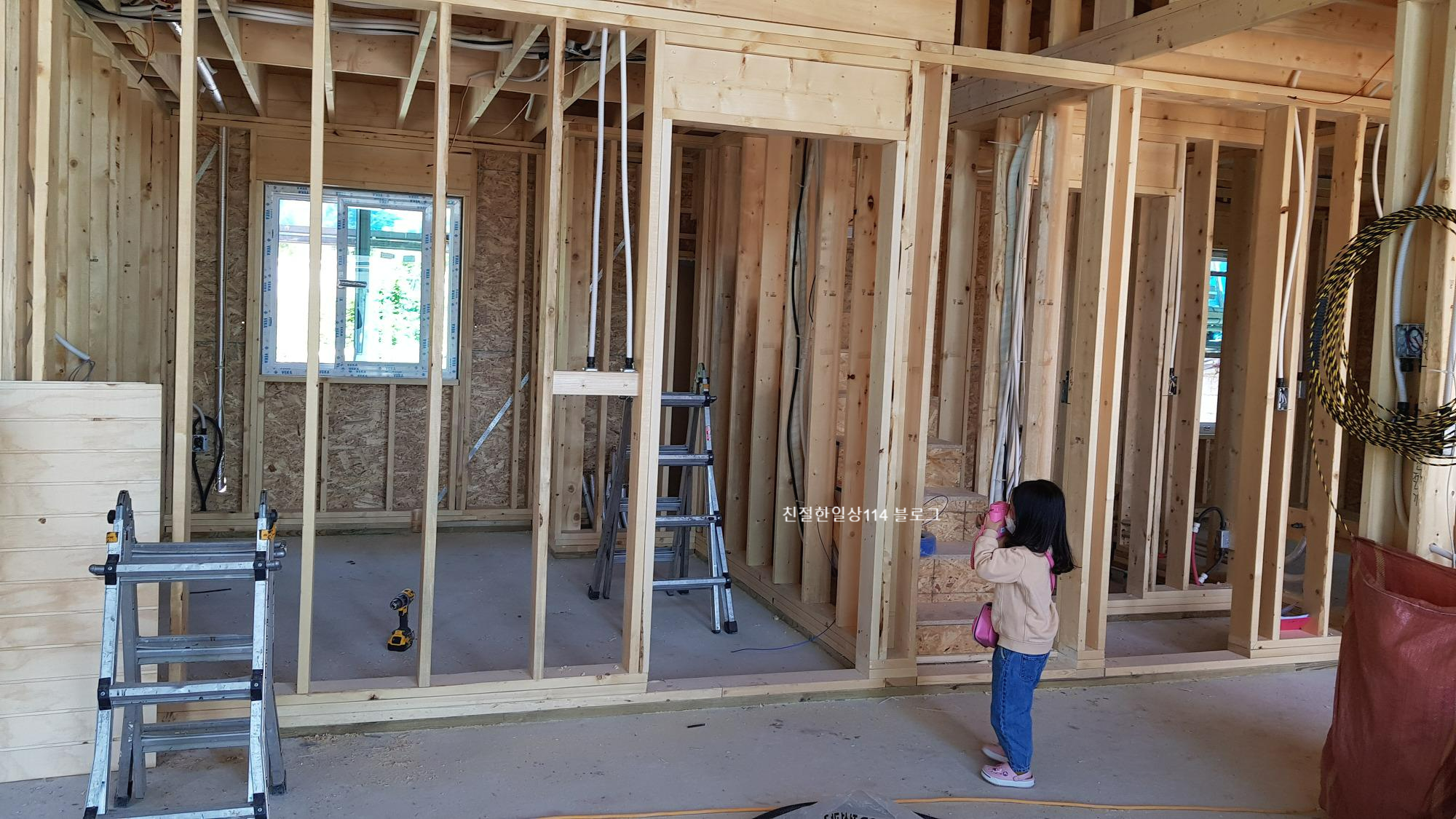 집 건물 내부 ‘벽’에 석고보드로 마감을 하니 ‘벽면’이 생겼다. 그전까지는 골조로 세운 스터드 목재 사이로 옆의 다른 공간이 보이고 건물 바깥도 보이고 했었는데 이렇게 석고보드를 쳐 놓으니 방과 거실, 화장실 등 각 공간이 네모 반듯해 지고 공간별 크기가 얼마나 되는지 확연히 알 수 있다.