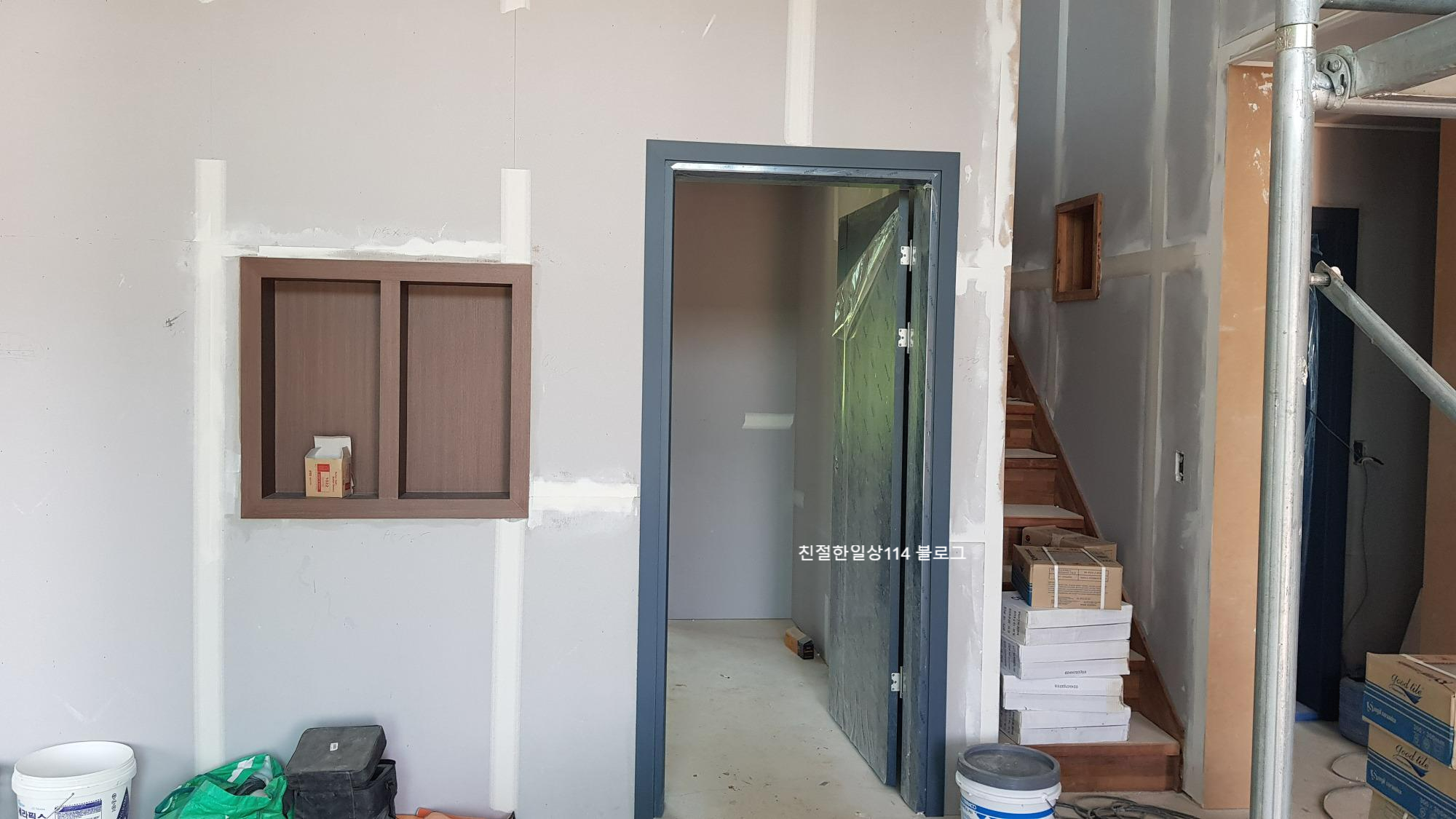 제일 먼저 문과 계단을 작업한다. 문과 계단은 골조 작업을 했던 목수팀이 일을 맡아서 진행하며 공사는 약 3일정도 소요될 예정이다.