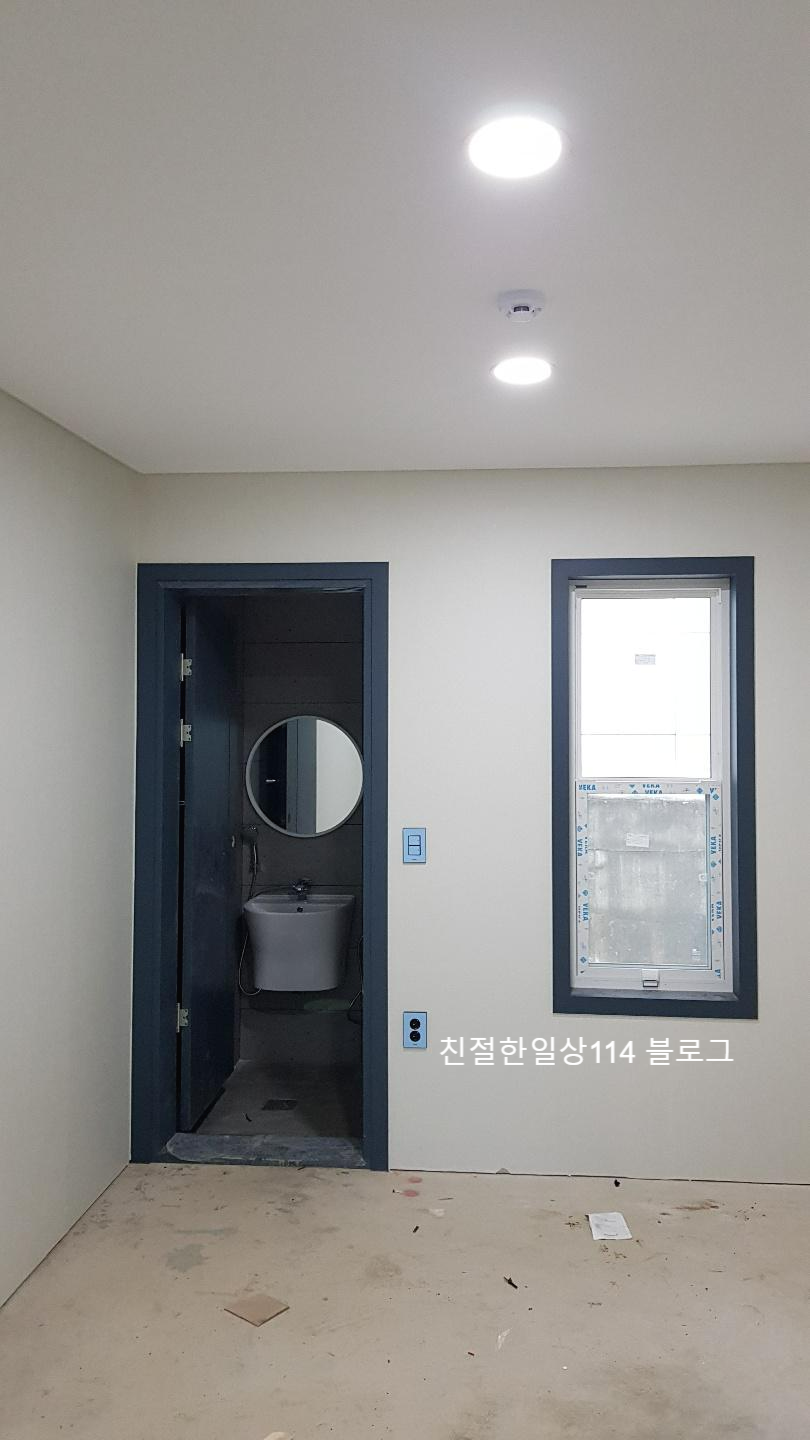 드레스룸과 세탁기를 놓을 다용도실에는 슬라이딩 도어를 설치했다. 같은 딥오션의 색상으로 한다. 슬라이딩 도어의 장점으로는 문을 옆으로 밀어서 벽사이로 넣기 때문에 문을 열고 닫는데 공간이 필요치 않다는 점이다! 아주 좋은 장점이다. 하지만 장점만 있을 수는 없다. 단점으로는 위 아래에 있는 틈이 방문보다는 커서 단열과 방음에 취약하다는 점이다. 외기에 바로 접하는 곳이 아니다보니 단열은 상관없지만 세탁기가 돌아가는 소음은 틈사이로 어느정도는 들린다.