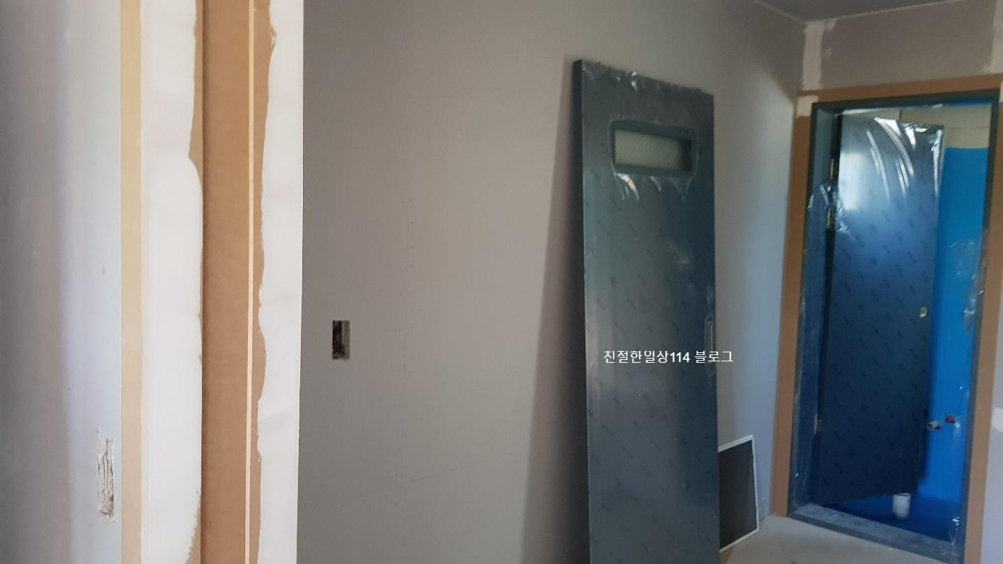 방문을 달아내고 인테리어 필름 작업까지 한 후 찍은 현장 사진이다. 새로 설치한 방문에는 보호 필름이 붙어있다. 아직 남은 시공과정이 남았기에 공사가 끝나고 준공청소를 하면서 떼어내면 된다.