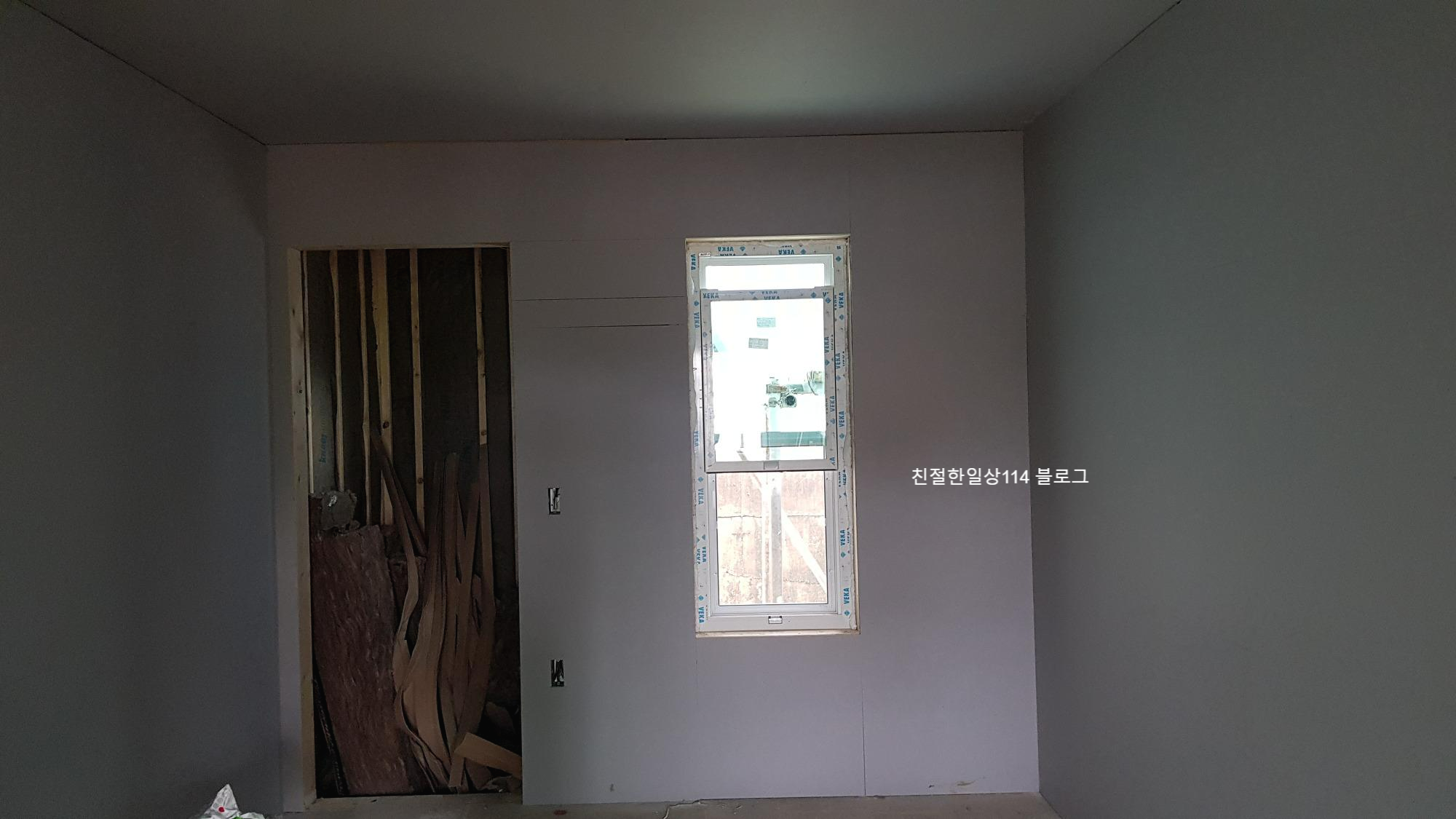 집 건물 내부 ‘벽’에 석고보드로 마감을 하니 ‘벽면’이 생겼다. 그전까지는 골조로 세운 스터드 목재 사이로 옆의 다른 공간이 보이고 건물 바깥도 보이고 했었는데 이렇게 석고보드를 쳐 놓으니 방과 거실, 화장실 등 각 공간이 네모 반듯해 지고 공간별 크기가 얼마나 되는지 확연히 알 수 있다.
