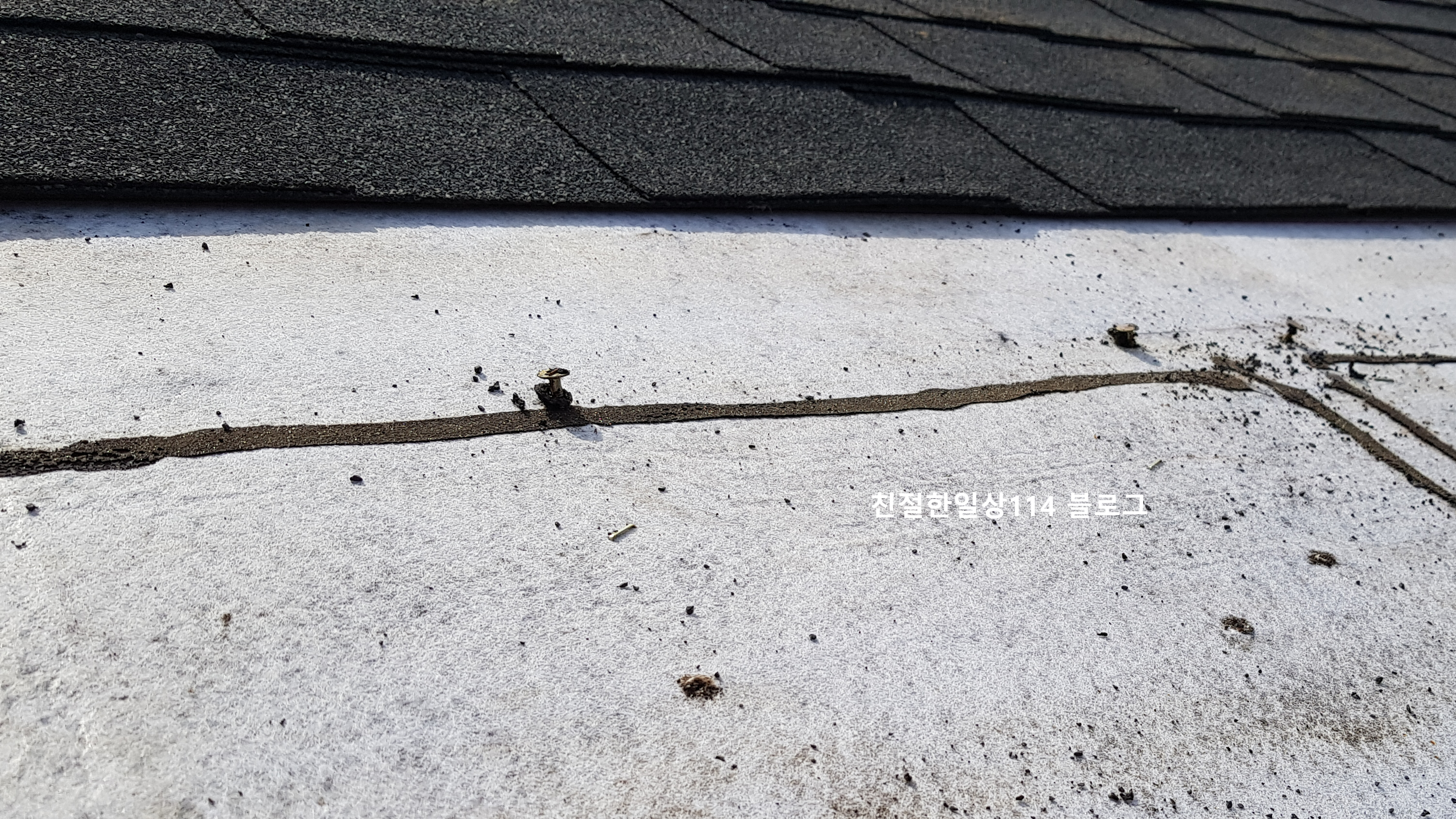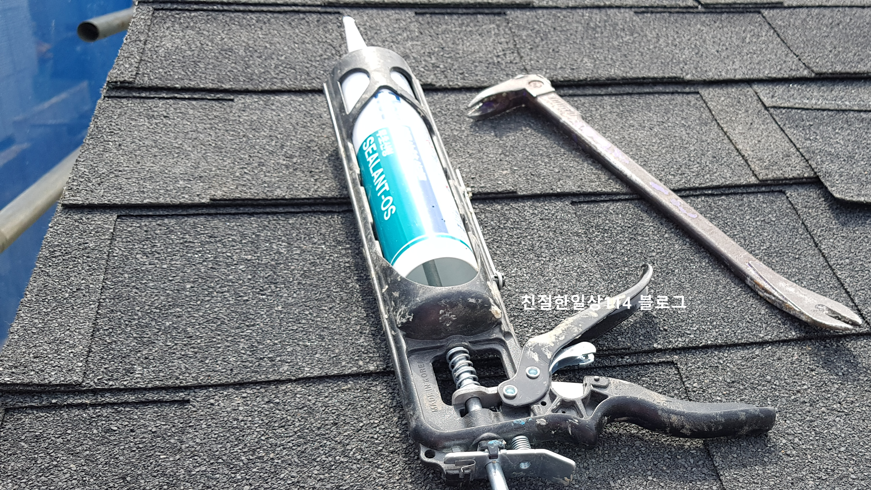 슁글을 고정시키기 위해 못을 박은 자리에도 실란트를 쏴서 틈을 다시한번 메꿔준다.