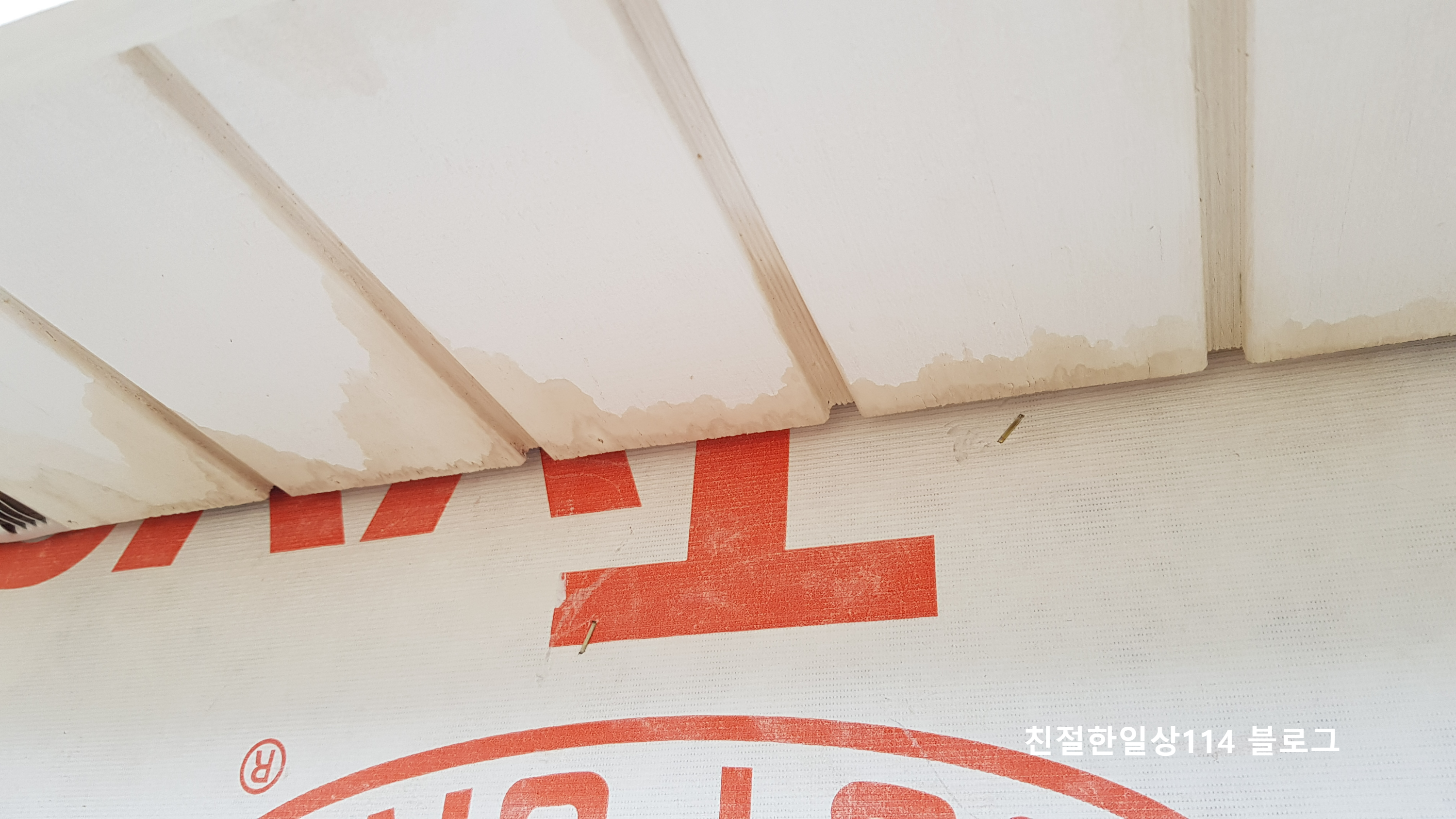 오시공된 끝 부분의 슁글을 걷어내고 방수시트가 다 마르고 난 뒤 부수를 진행하기로 했다. 건조되는 동안 비가 올 것에 대비해 타이백으로 덮어두었는데 그 뒤 한차례 비가 쏟아졌다.