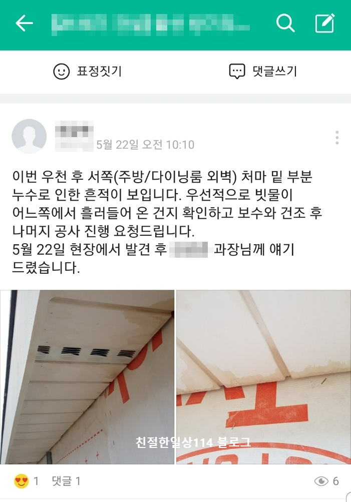 시공사 담당 과장이 현장에 없어서 전화로 사실을 알렸다. 그리고 이번 문제를 정확히 진단하고 조치 완료하고 공사진행을 원해 시공사에서 만들어둔 밴드에도 직접 내용 작성해 올렸다. 그래야 시공사 대표도 이 사실을 인지하고 제대로 된 조치를 취할 것 같아서 였다.