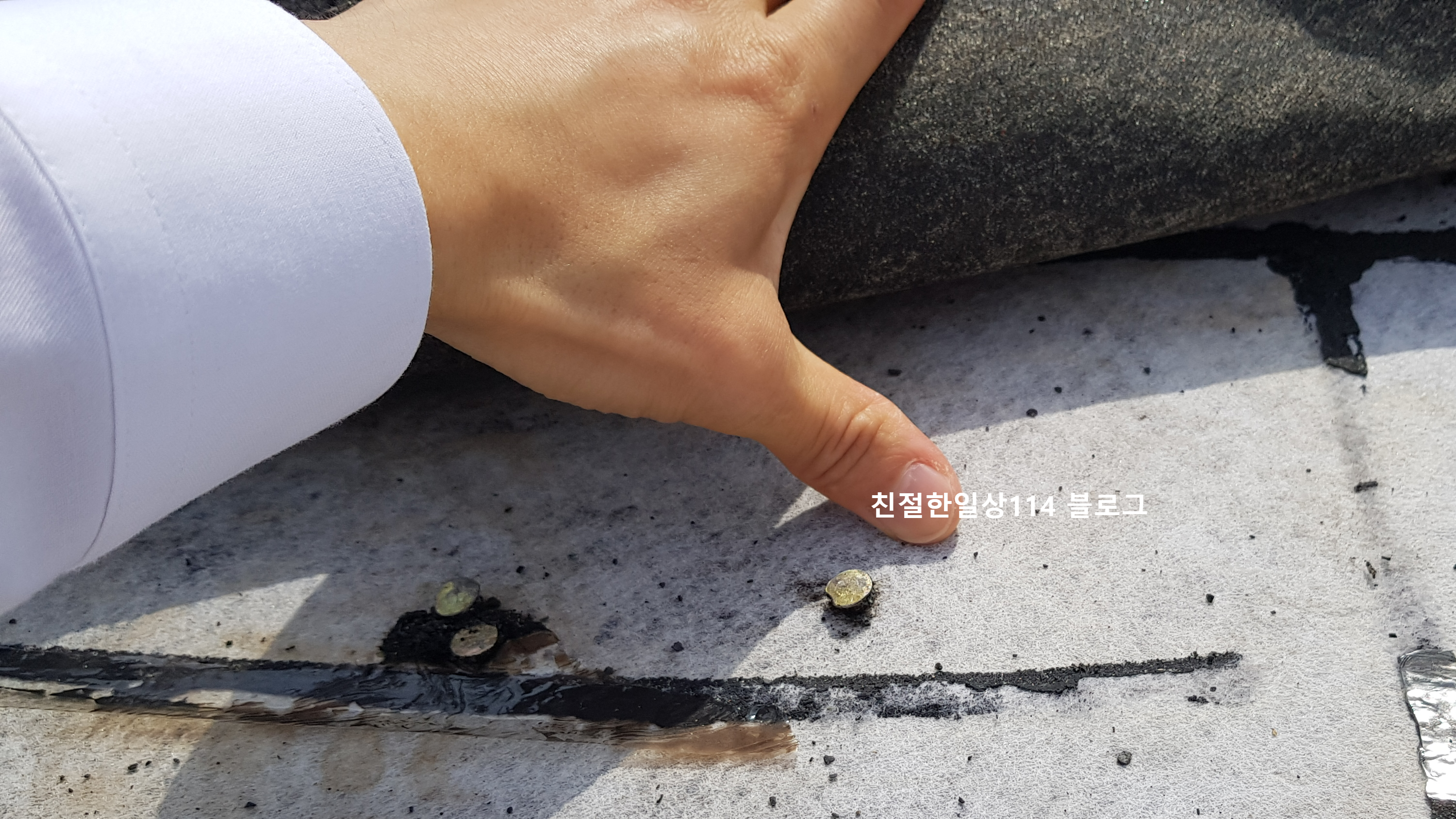 슁글을 고정시키기 위해 못을 박은 자리에도 실란트를 쏴서 틈을 다시한번 메꿔준다.