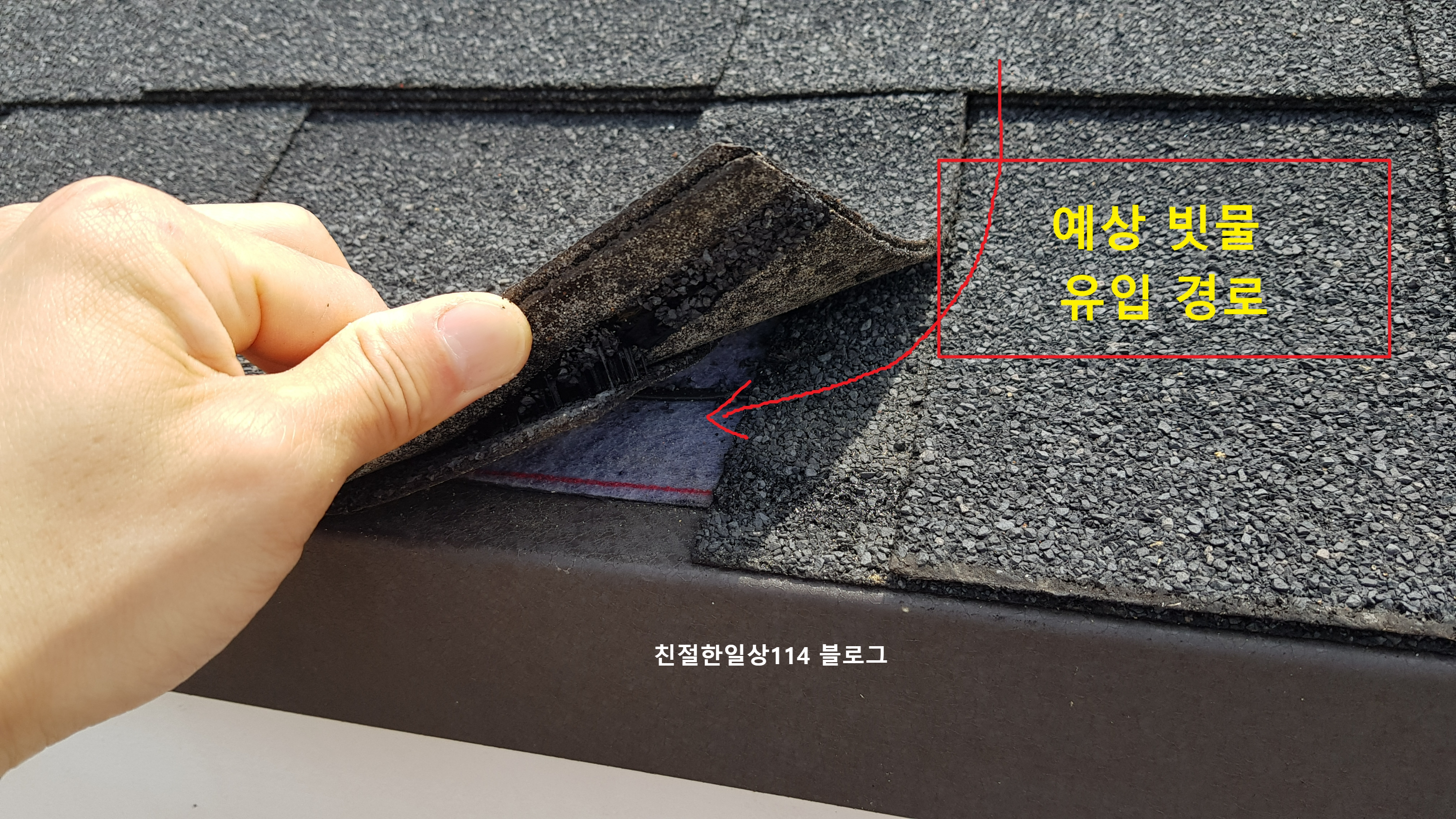 위 사진을 보면 이중그림자 슁글의 틈이 있는 부분이 아래쪽으로 붙여져 있다. 이와는 반대로 틈이 있는 부분이 위쪽으로 올라가야 하며 포개어지는 다른 슁글이 이 틈을 바깥쪽에서 덮어주는 방식으로 시공 되어야 한다.