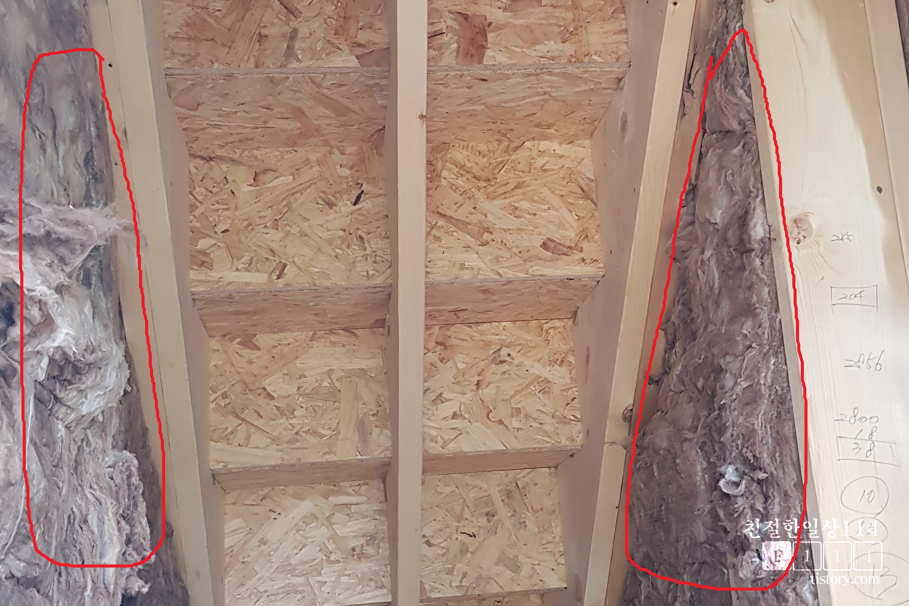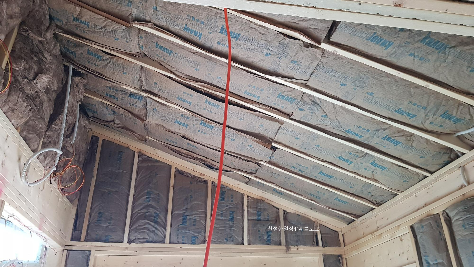오픈천장으로 천고가 높다. 글라스울 단열재는 한쪽에는 코팅된 종이가 붙어있고 한쪽면에는 유리섬유 그대로 노출되어있다. 이런 제품이 한쪽으로 습기와 공기를 내보낼 수 있어 좋다고 한다.