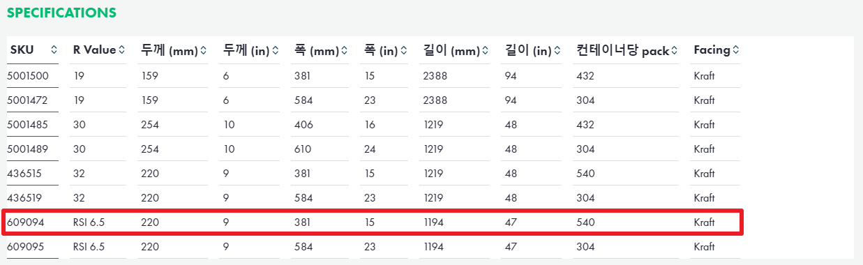 크나우프사에서 나오는 인슐레이션은 지붕과 천장용, 벽체용, 덕트 보온용, 외벽단열용 등 사용되는 용도에 따라 여러 종류로 제조되어 나온다. 아래에 크나우프에서 제조하는 지붕천장용 단열재와 벽체용 단열재 등급표를 캡쳐해 보았으니 참고하면 되겠다. 빨간색으로 체크박스 되어있는 제품은 업그레이드해서 시공된 등급을 표시해 보았다.