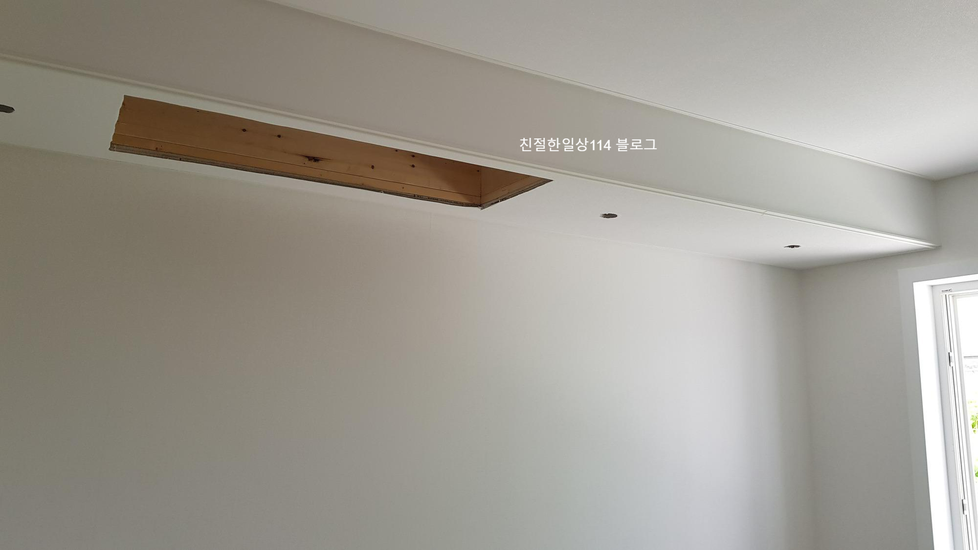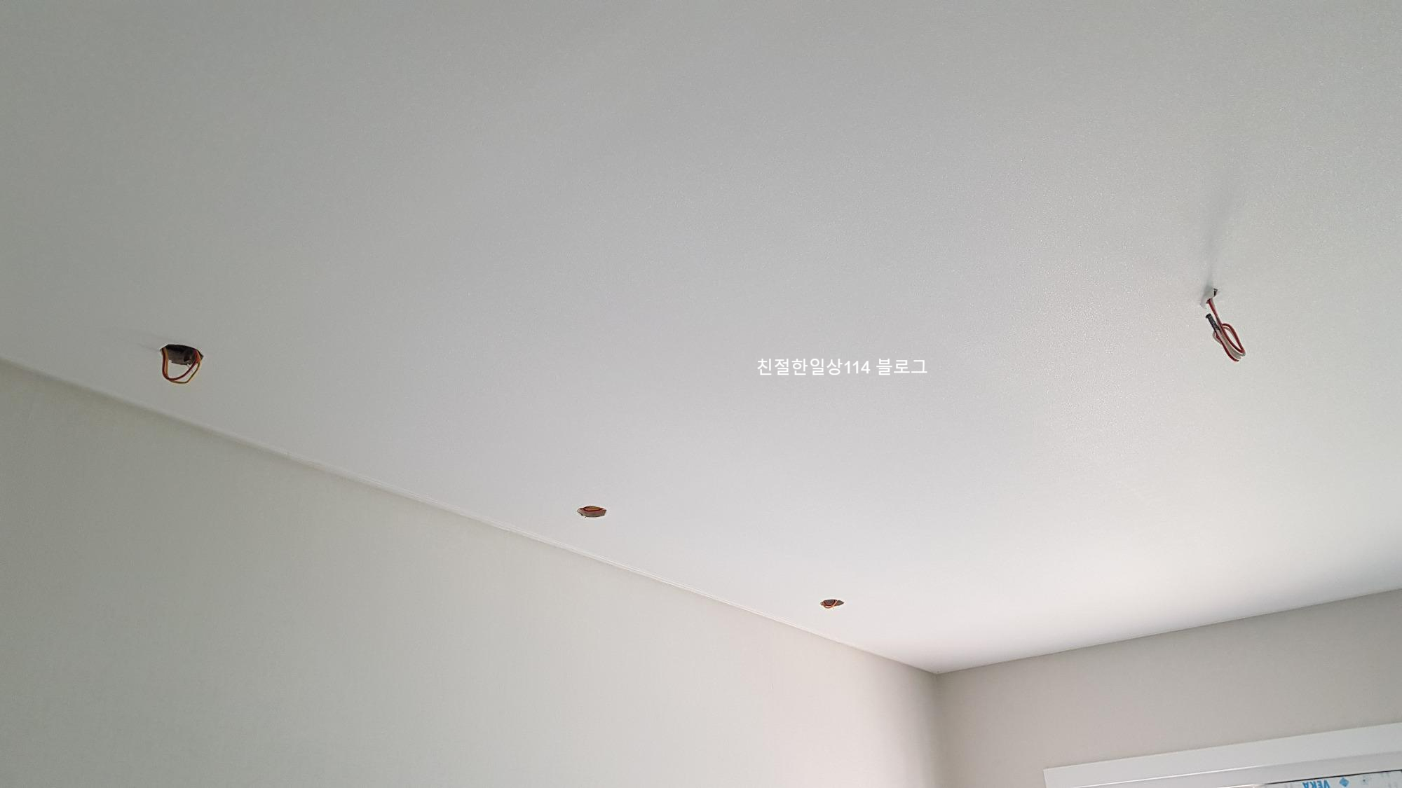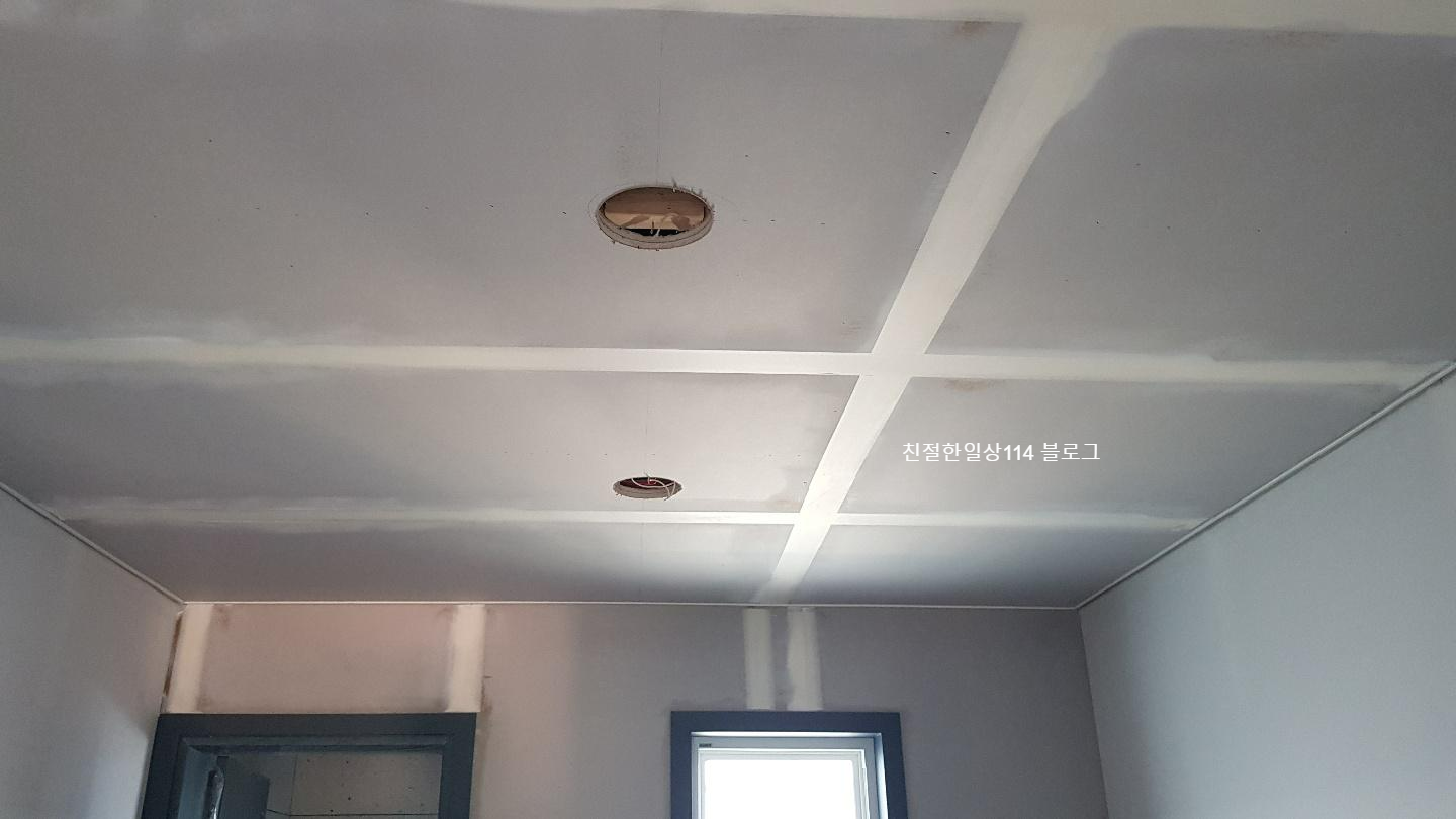벽지 시공이 다 된 작은 방. 천장에 난 큰 구멍은 시스템에어컨 자리이며 작은 구멍은 매립등 자리이다.