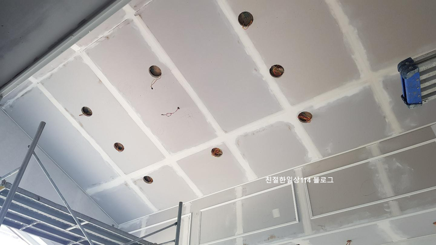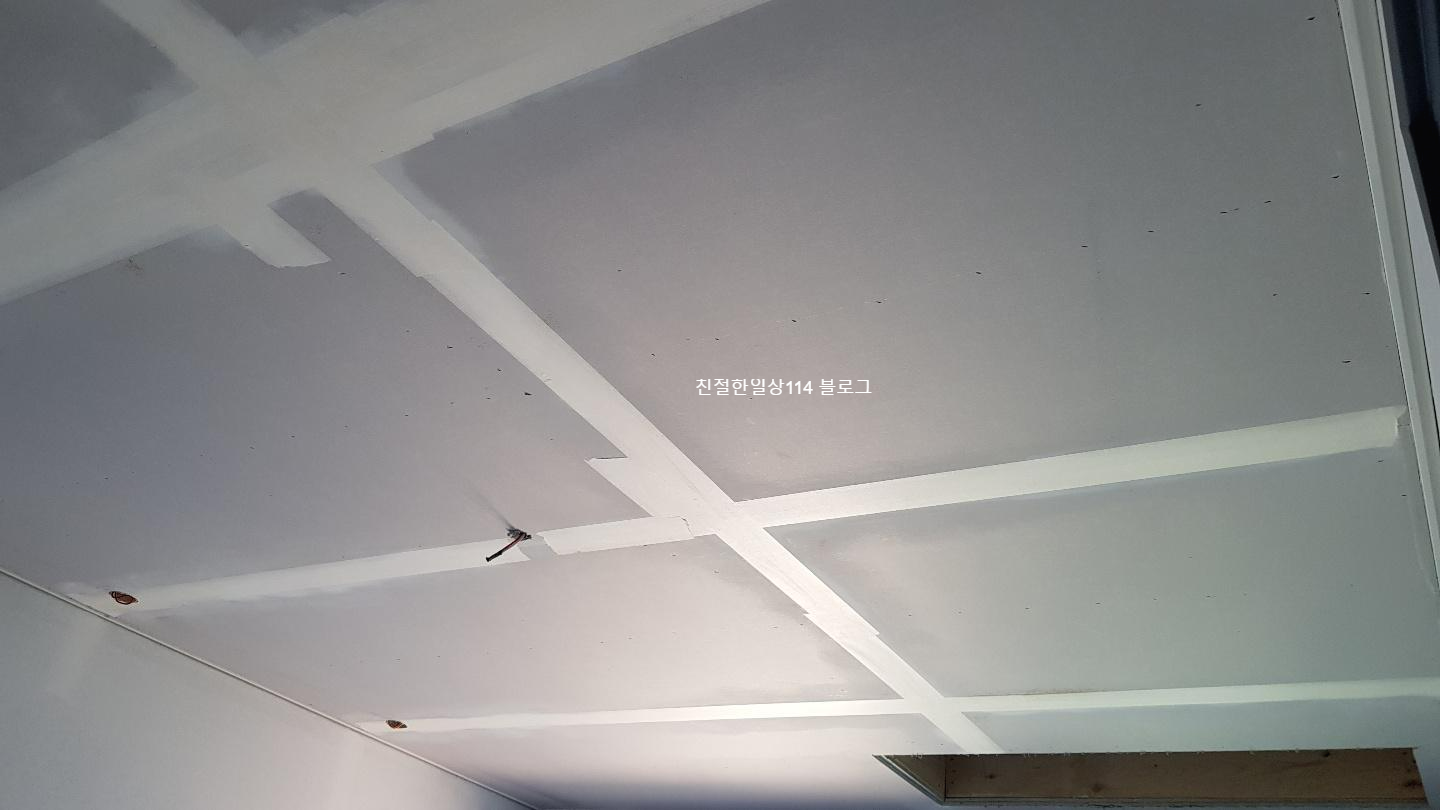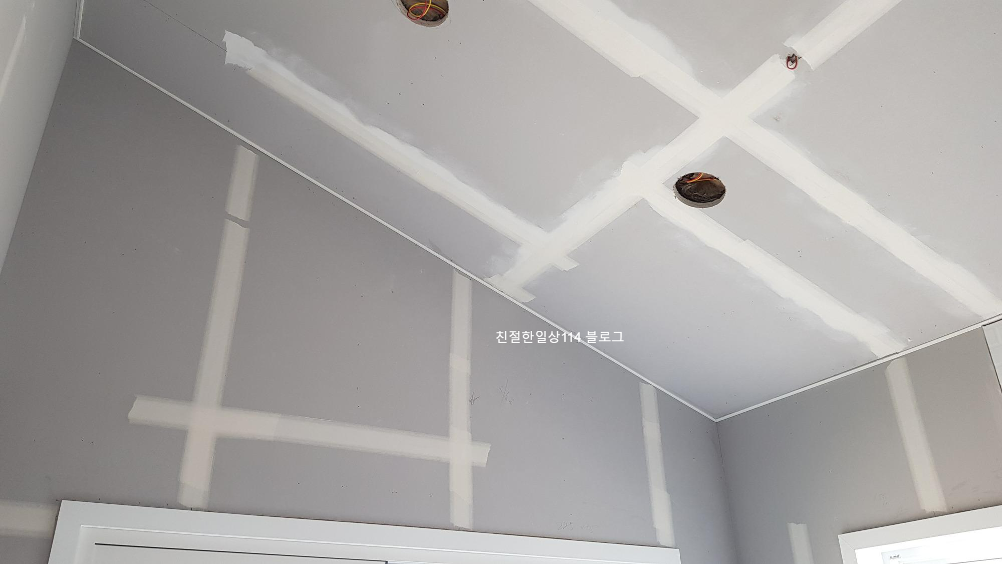 벽지 선택을 하던 날, 벽지 밑 작업이 진행되었다. 벽지 밑작업을 보니 석고보드 이음새에 페인트 같은 것을 바르고 있었다.