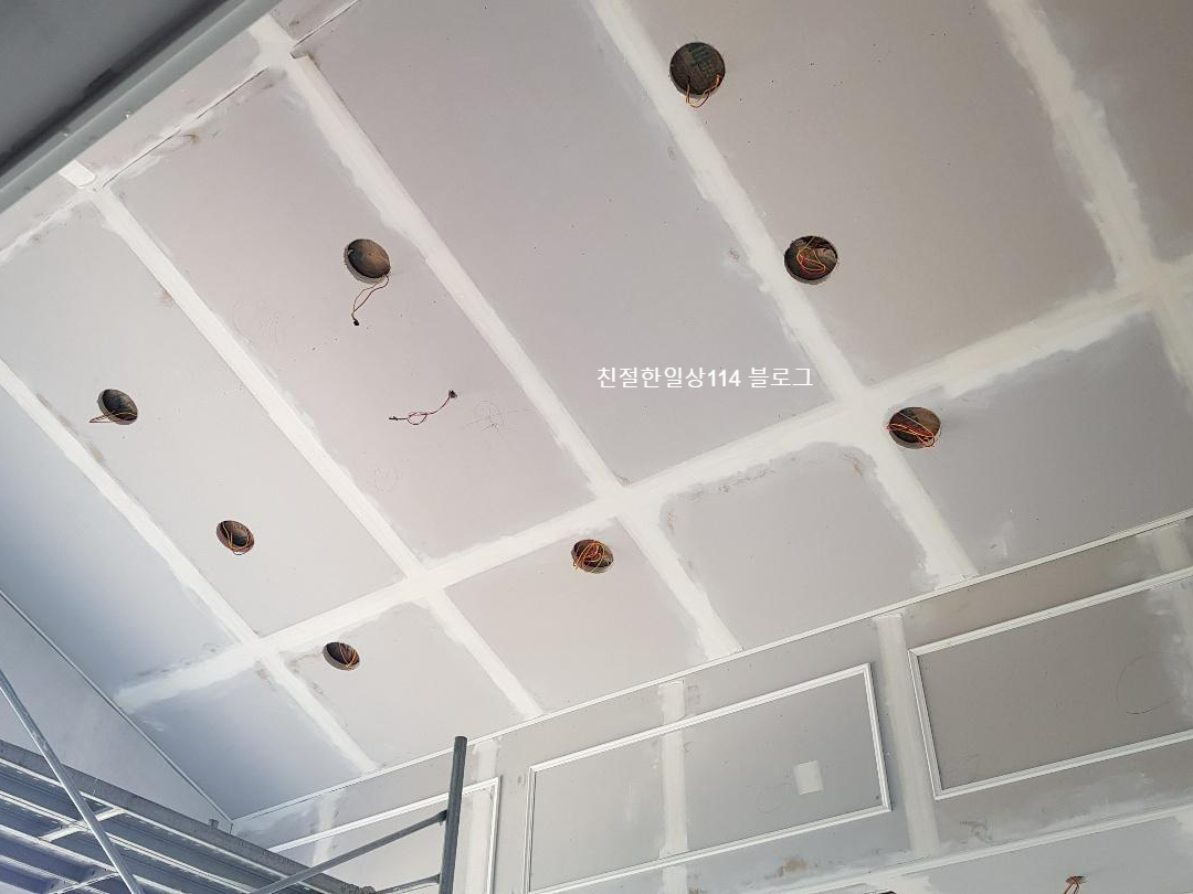 오웬스코닝으로 포인트를 준 거실 한켠, 그리고 천장에는 매입등을 달아낼 구멍이 뚤려있다.