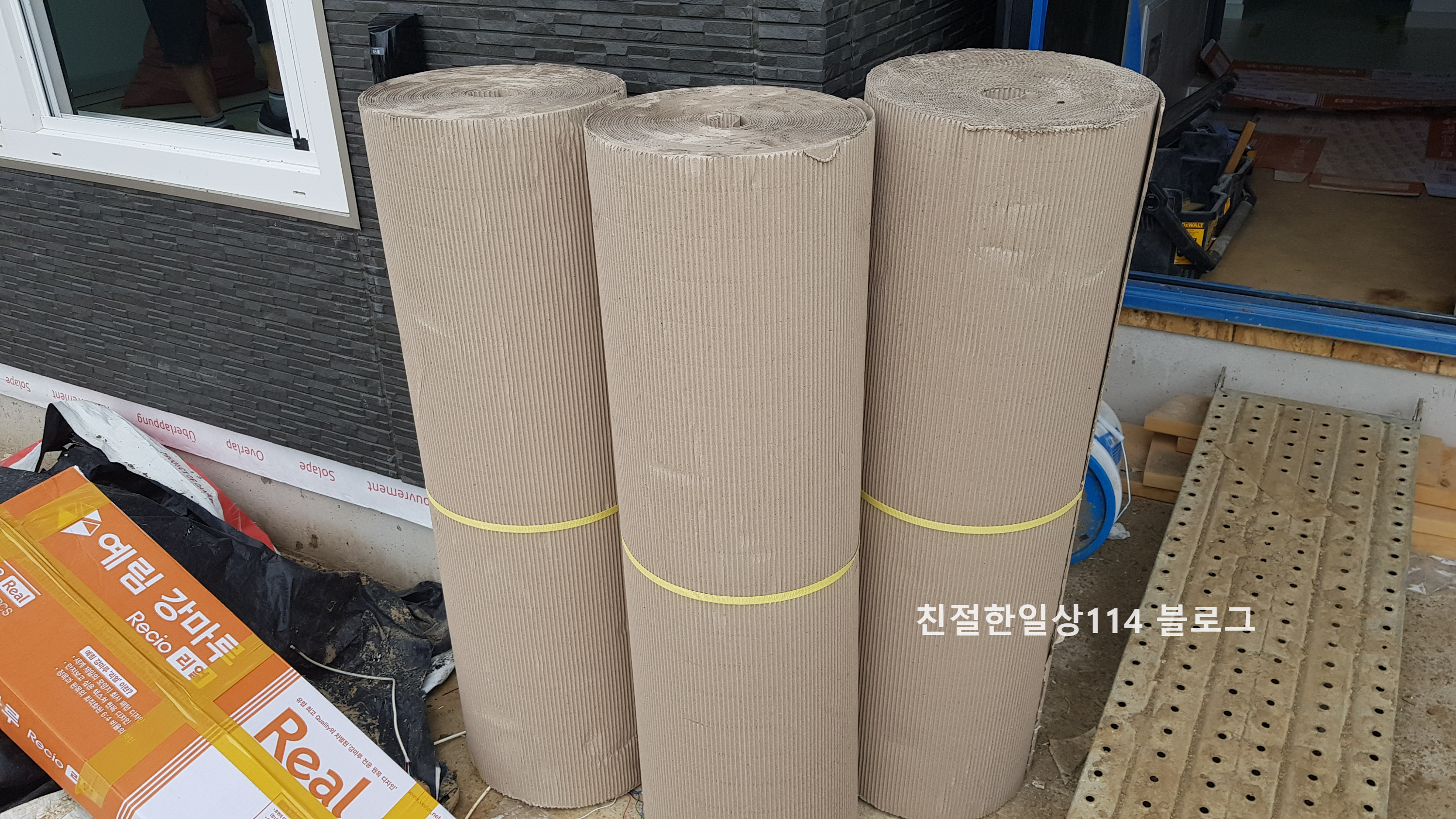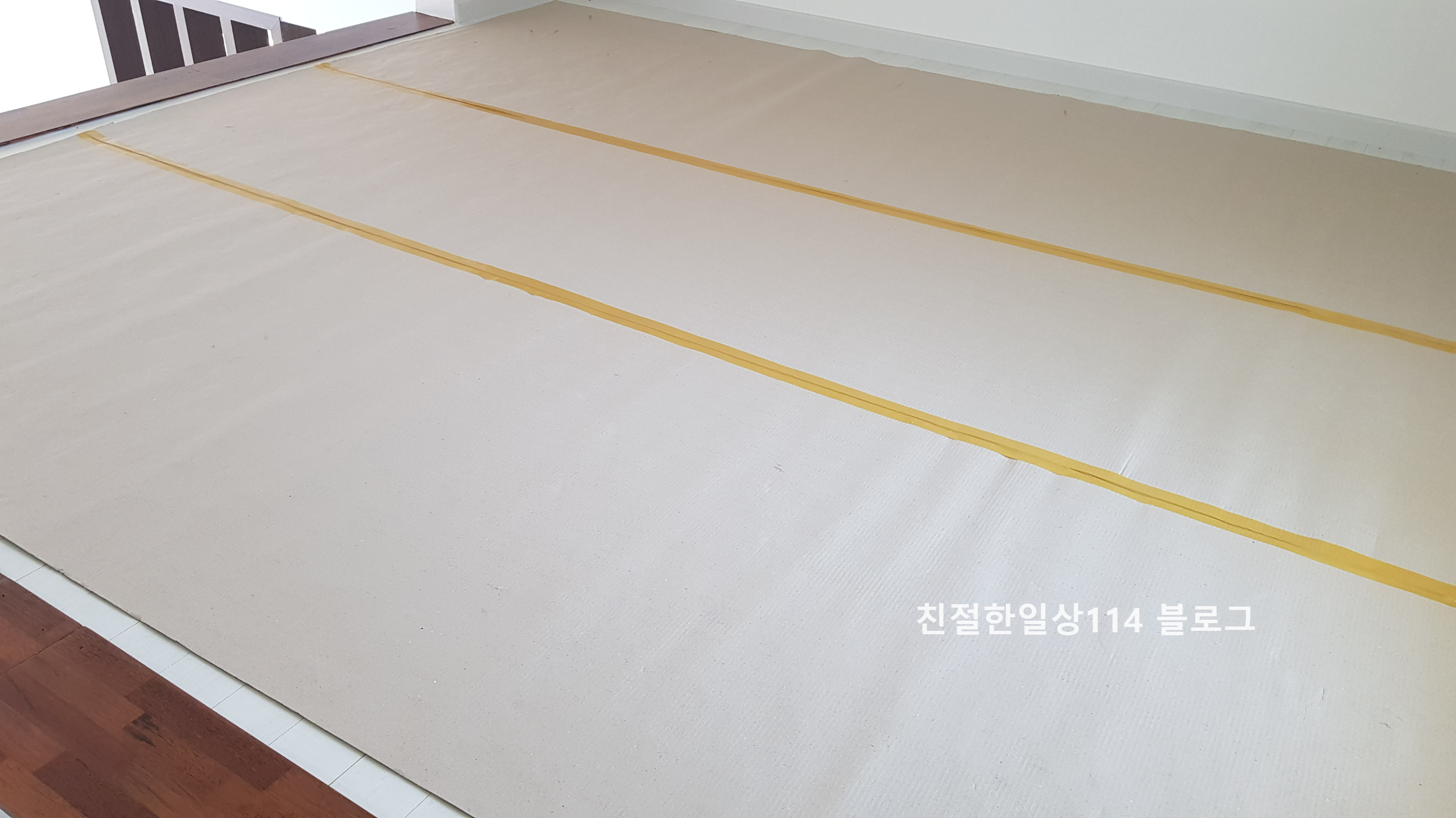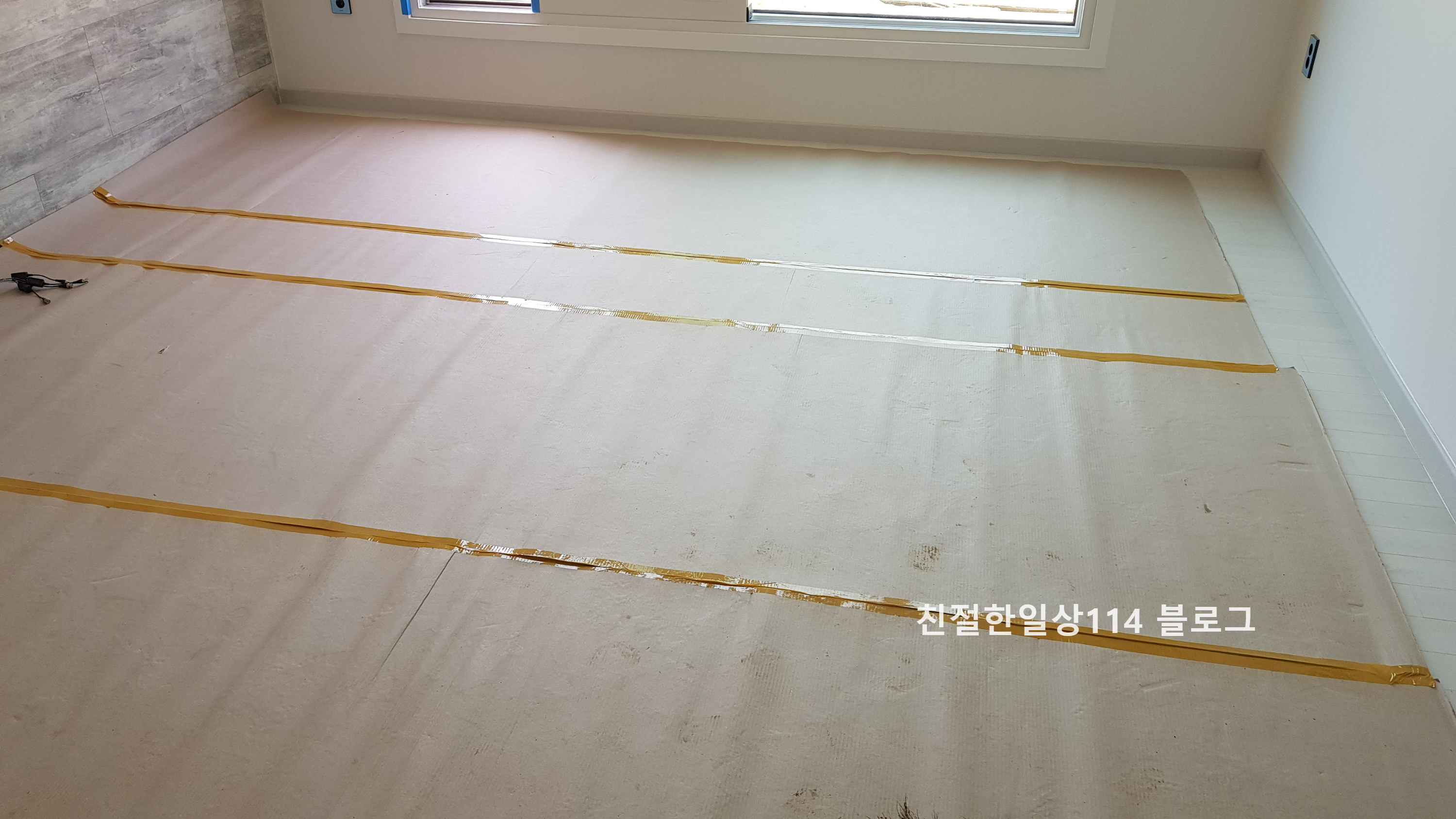마루 시공 후 마루를 보호할 두꺼운 보양제도 준비되어 있다. 마루 시공중인 실내로 들어가 보았다.