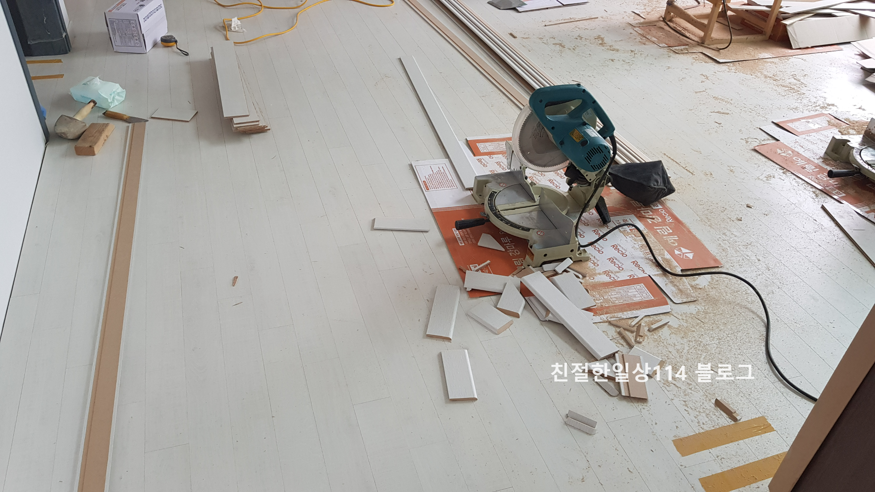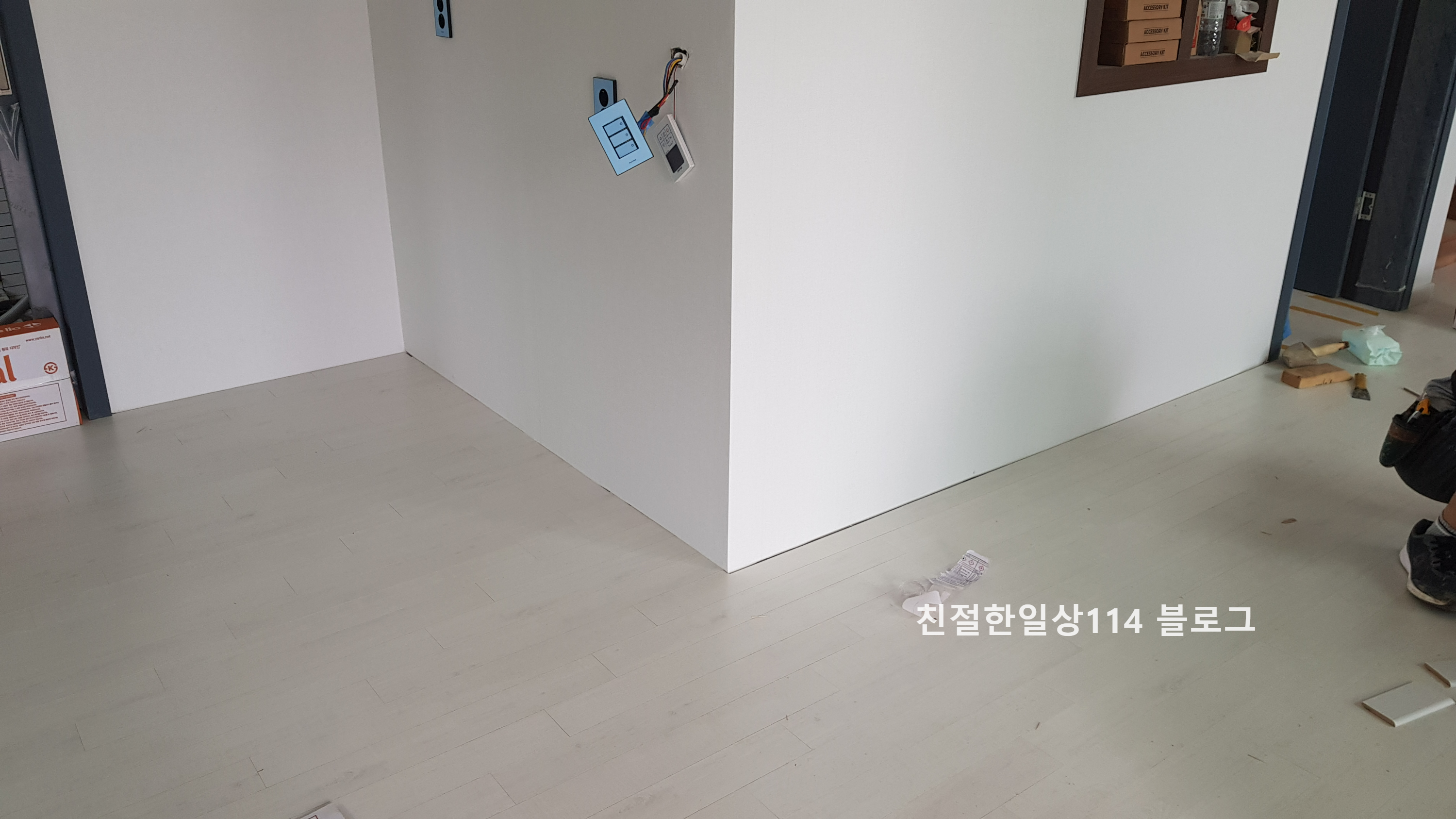 마루 시공을 끝내고 걸레받이도 강마루 색상에 맞춰서 시공을 한다. 시공이 되고나서 자리잡힐때까지 하루 정도는 밟지않고 놔둬는 것이 좋다. 그리고 마루 위에는 보양재를 덮어 혹시 모를 흠집에 대비해 놓는다.