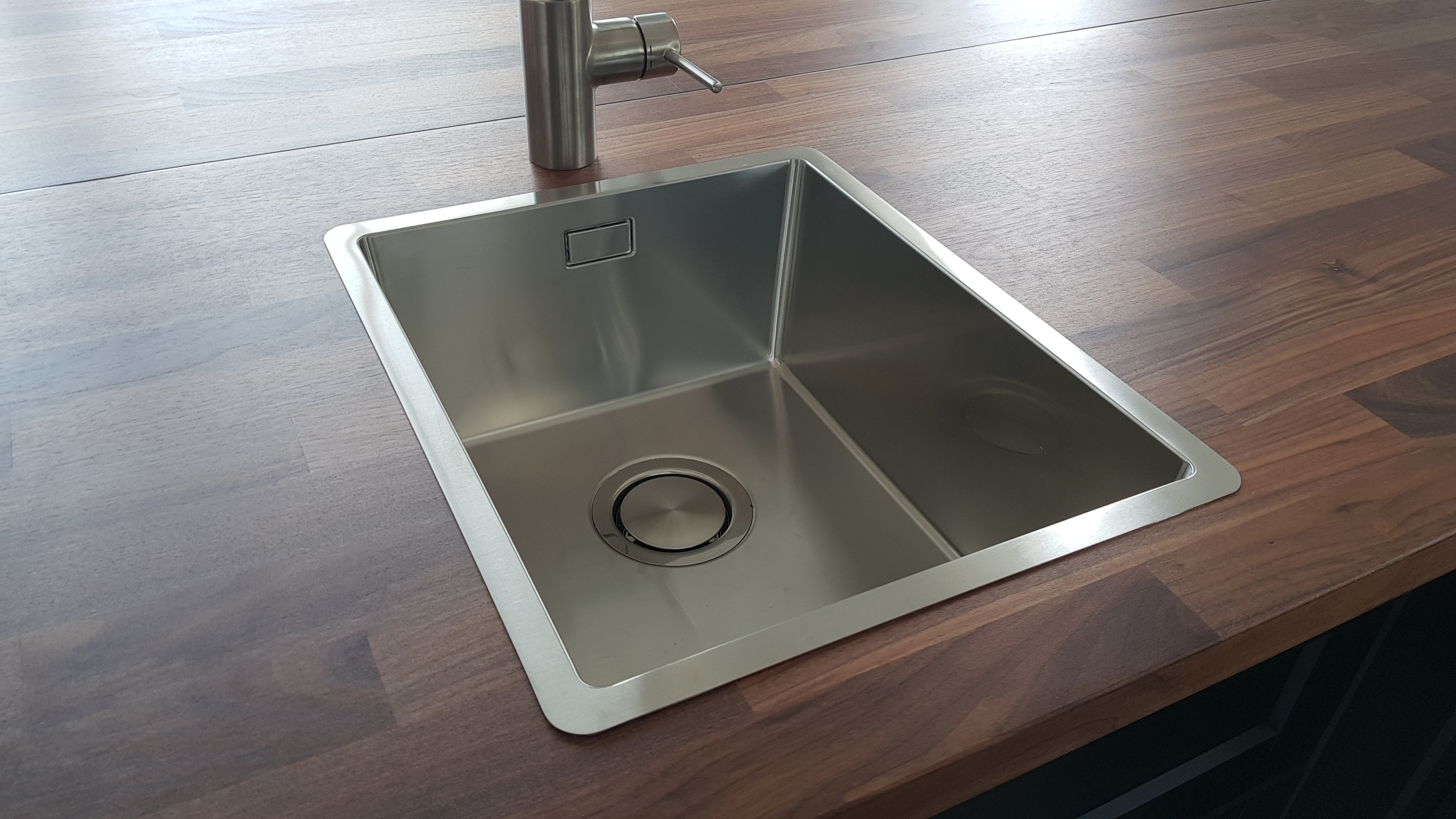 싱크대 설치가 완료 되었다. 상판의 짙은 호두나무 색상과 하부장 블랙 색상이 잘 어울리며 고급스럽게 보인다. 머릿속으로 그렸던 고급스러운 원목상판의 싱크대의 모습을 구현해 냈다. 다만 이케아 상판은 통원목이 아닌 무늬목이다.