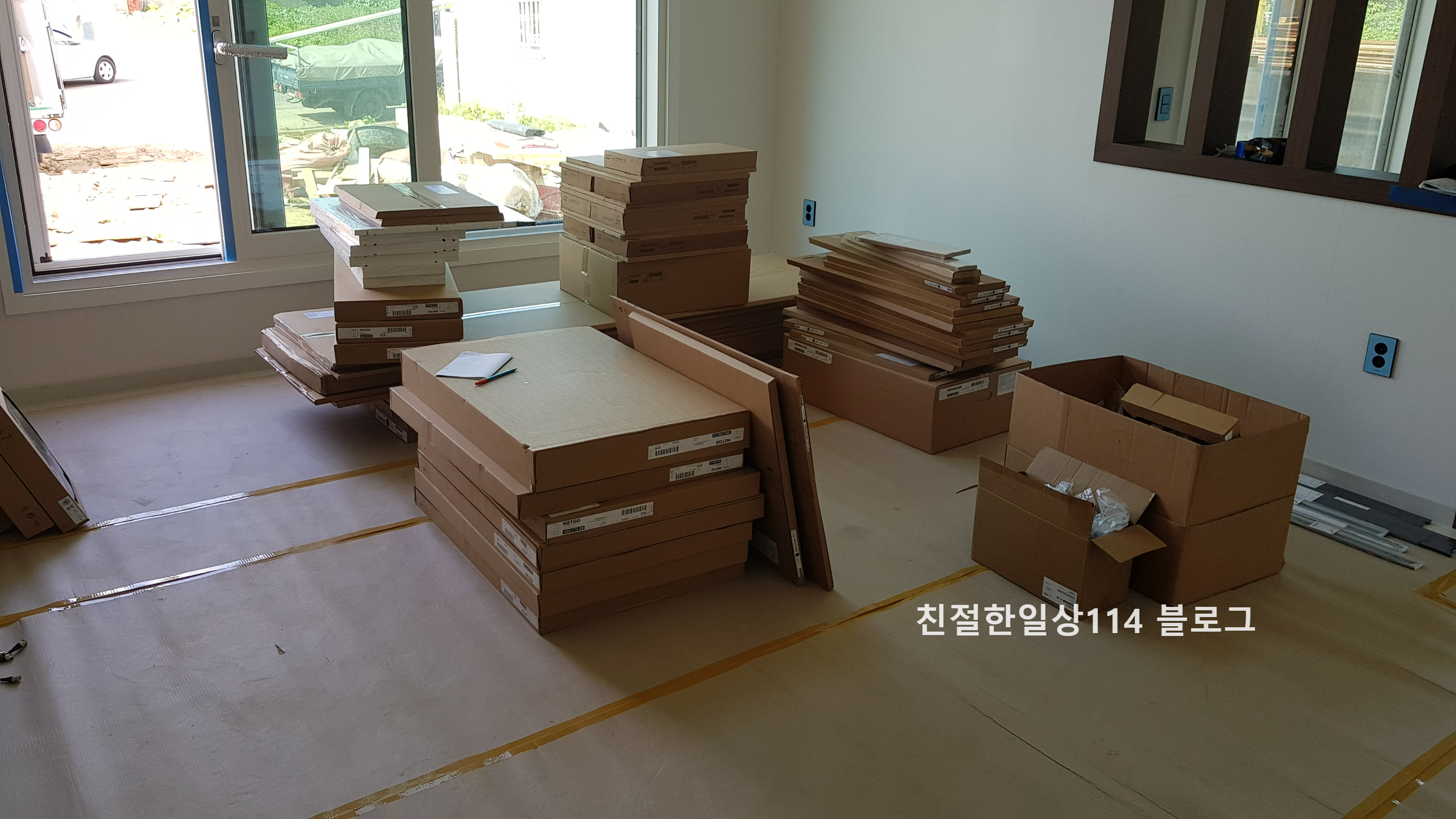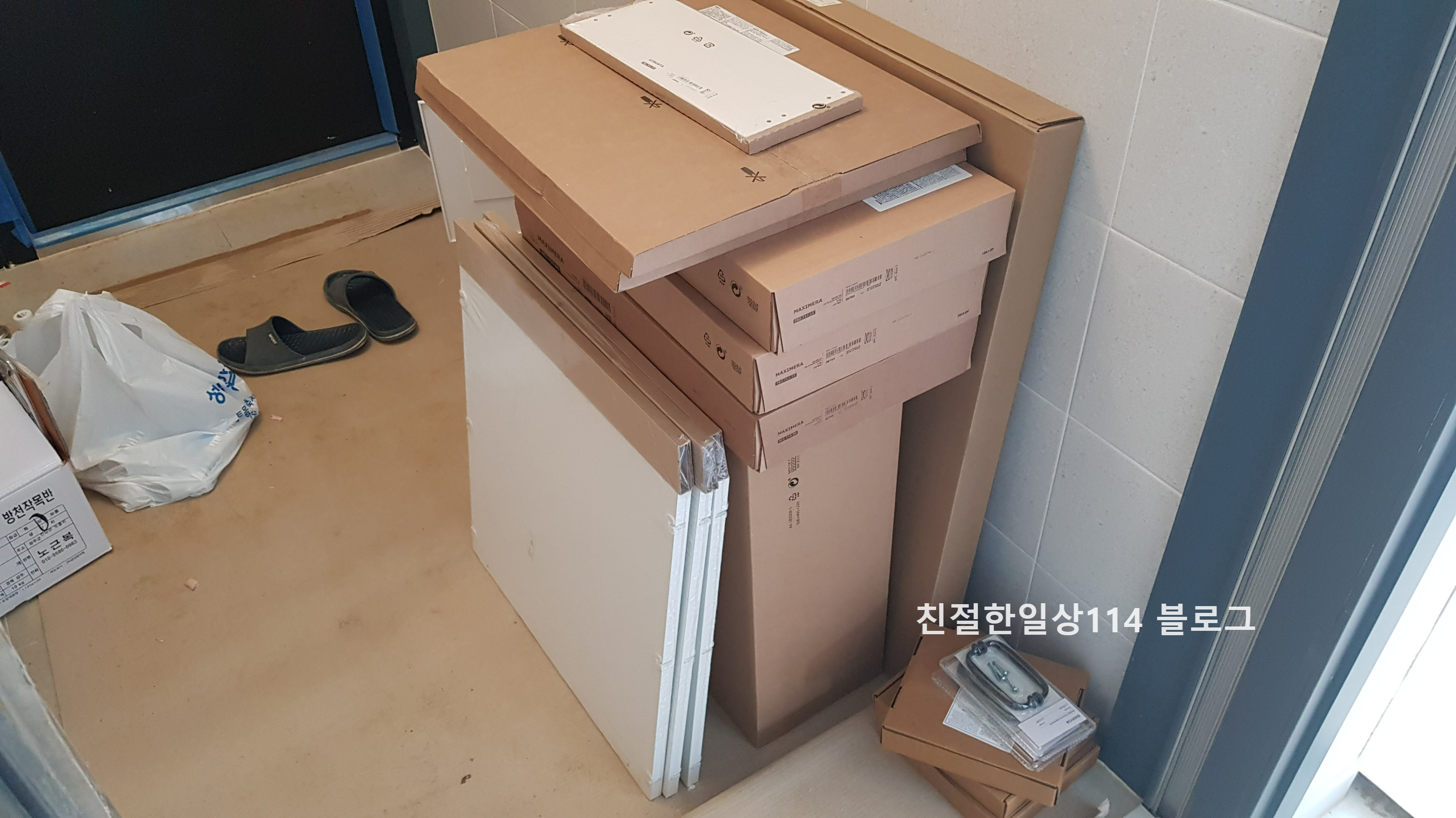 싱크대는 바닥재(강마루) 위에 설치를 해야하므로 마루 시공 뒤로 일정을 잡는다. 싱크대 설치 이틀전 물건을 현장으로 배송 받았고 설치는 하루만에 끝난다.