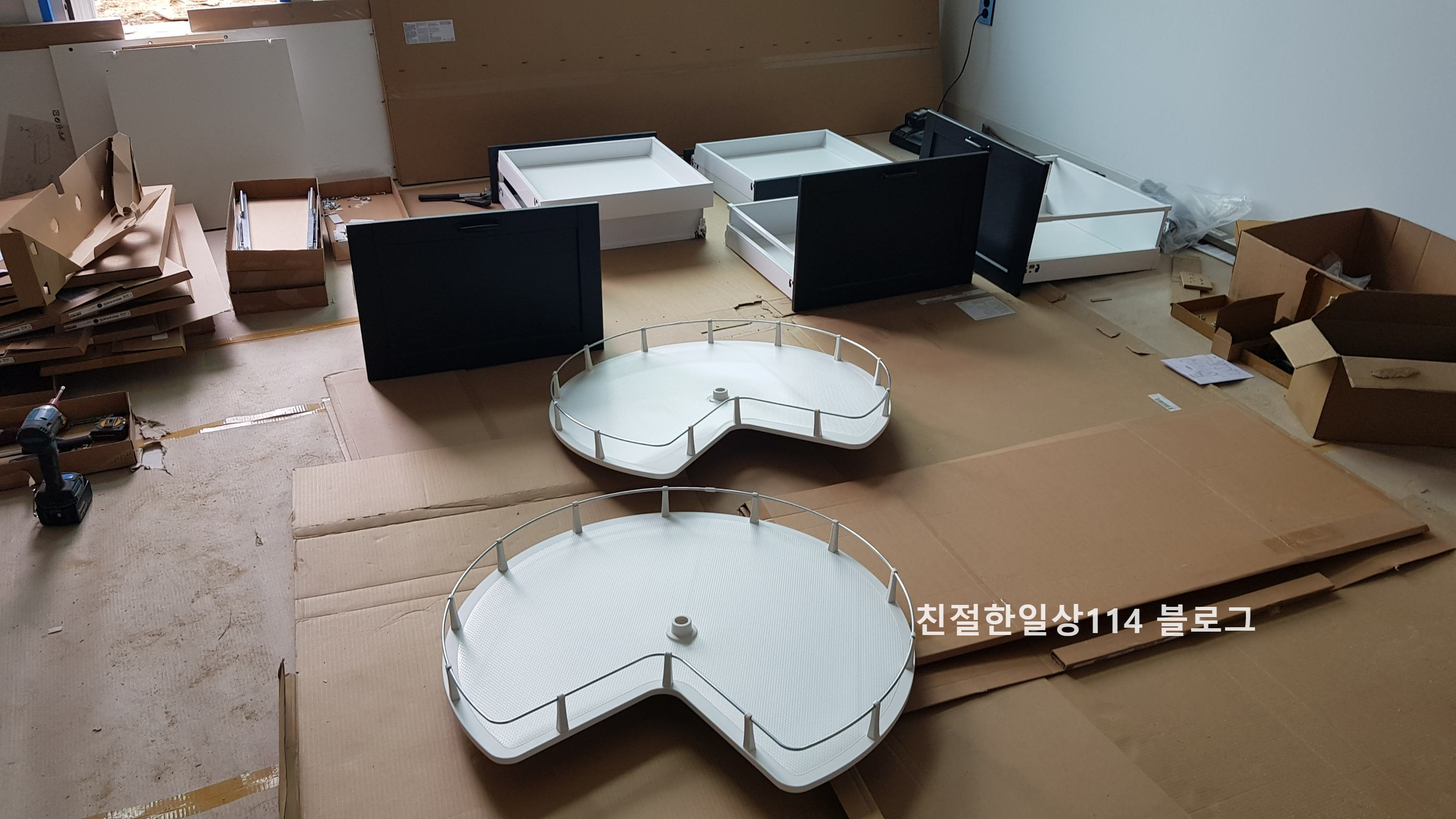 물건을 쌓아둔 거실에서 조립을 하고 주방으로 가져가 설치를 진행한다.
