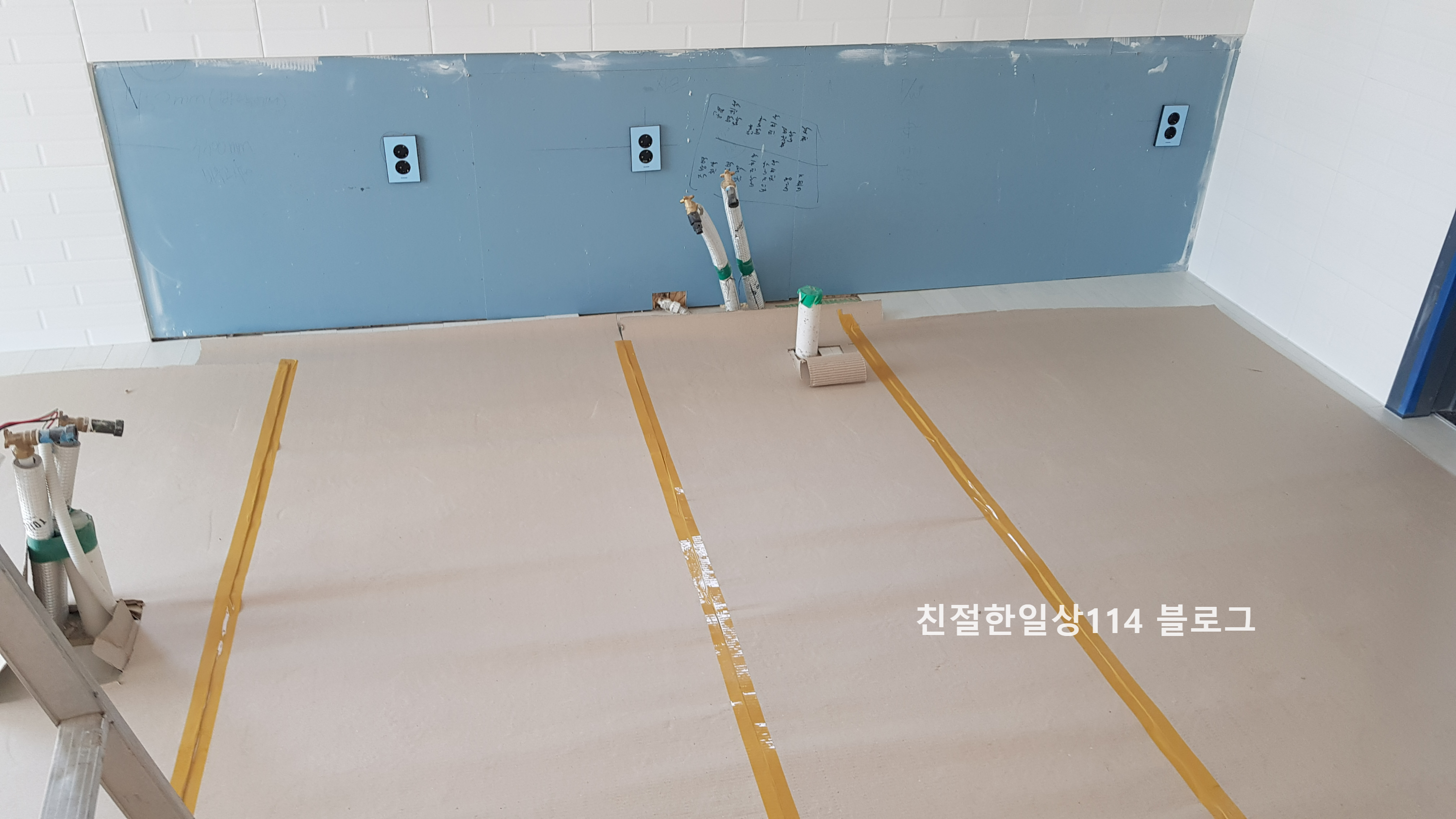 바닥에 마루재 시공시에는 최대한 벽쪽으로 붙여서 시공해야한다. 또한 주방 벽면 타일은 실측 당시 어디까지 붙이면 되는지 표시해주어 해당 표시선까지만 타일을 붙인다.