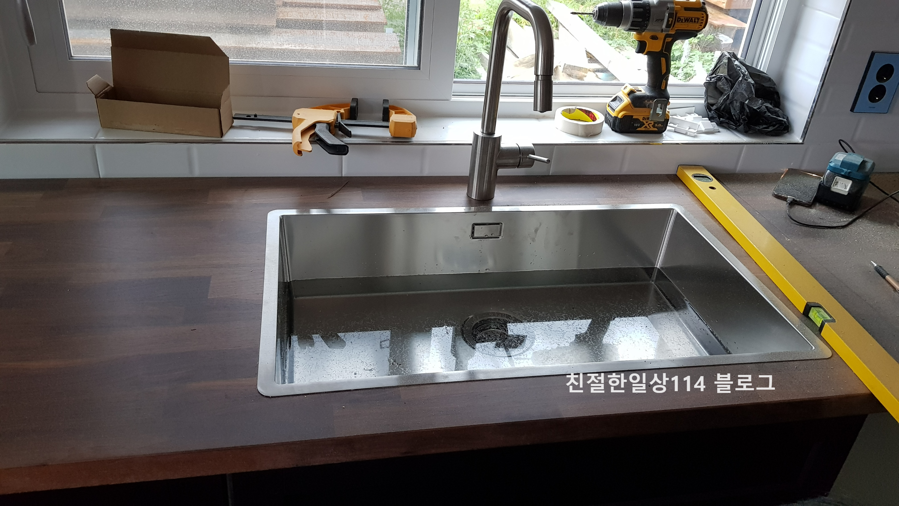 아일랜드식탁쪽의 작은 싱크볼과 수전이 먼저 설치되었다. 수전은 엘마렌의 코브라수도꼭지 제품이다.