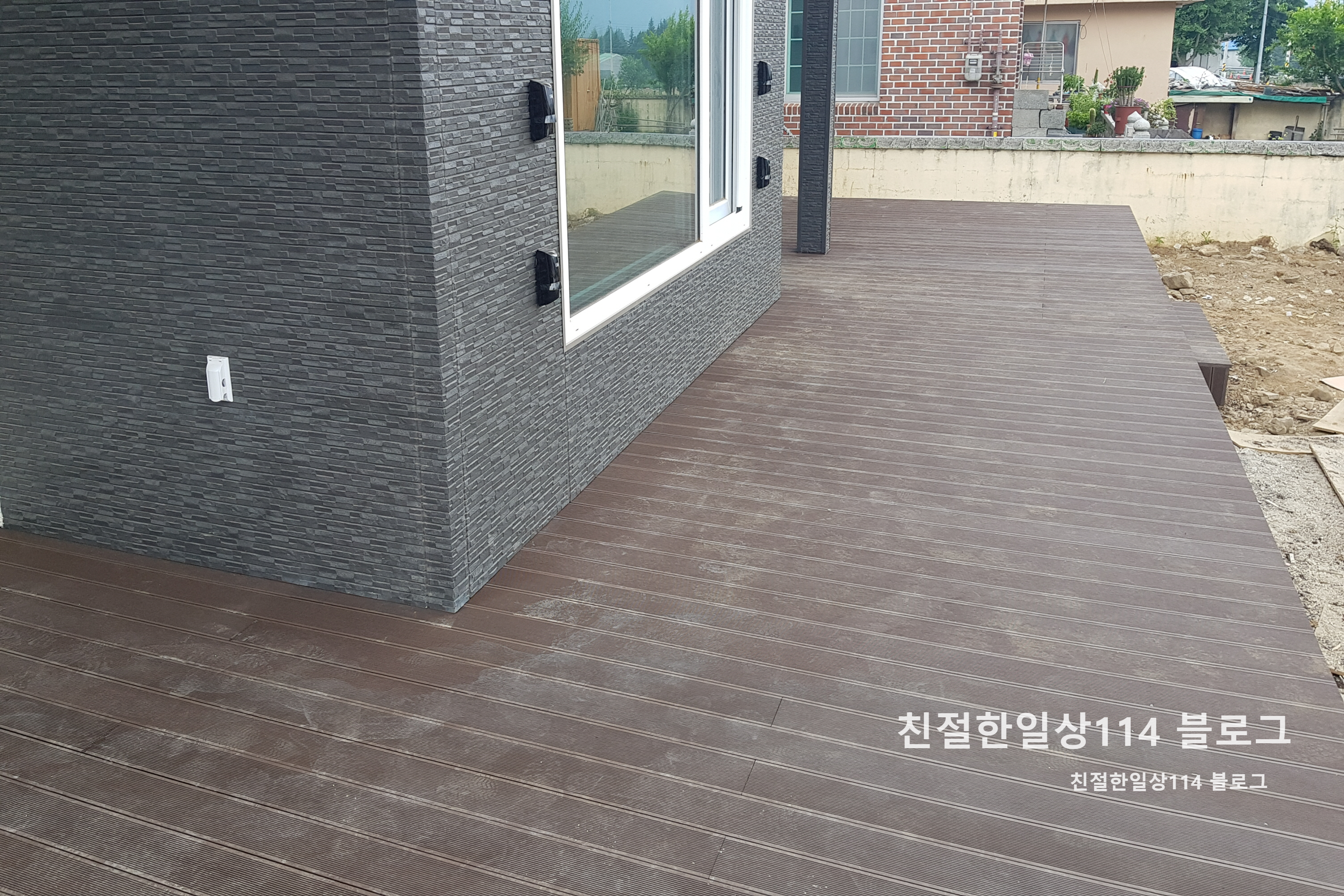 건물 외부디자인에는 짙은색의 석재데크가 더 울렸을 수도 있겠지만 이것도 잘 어울린다. 만족스럽게 시공이 되었다.