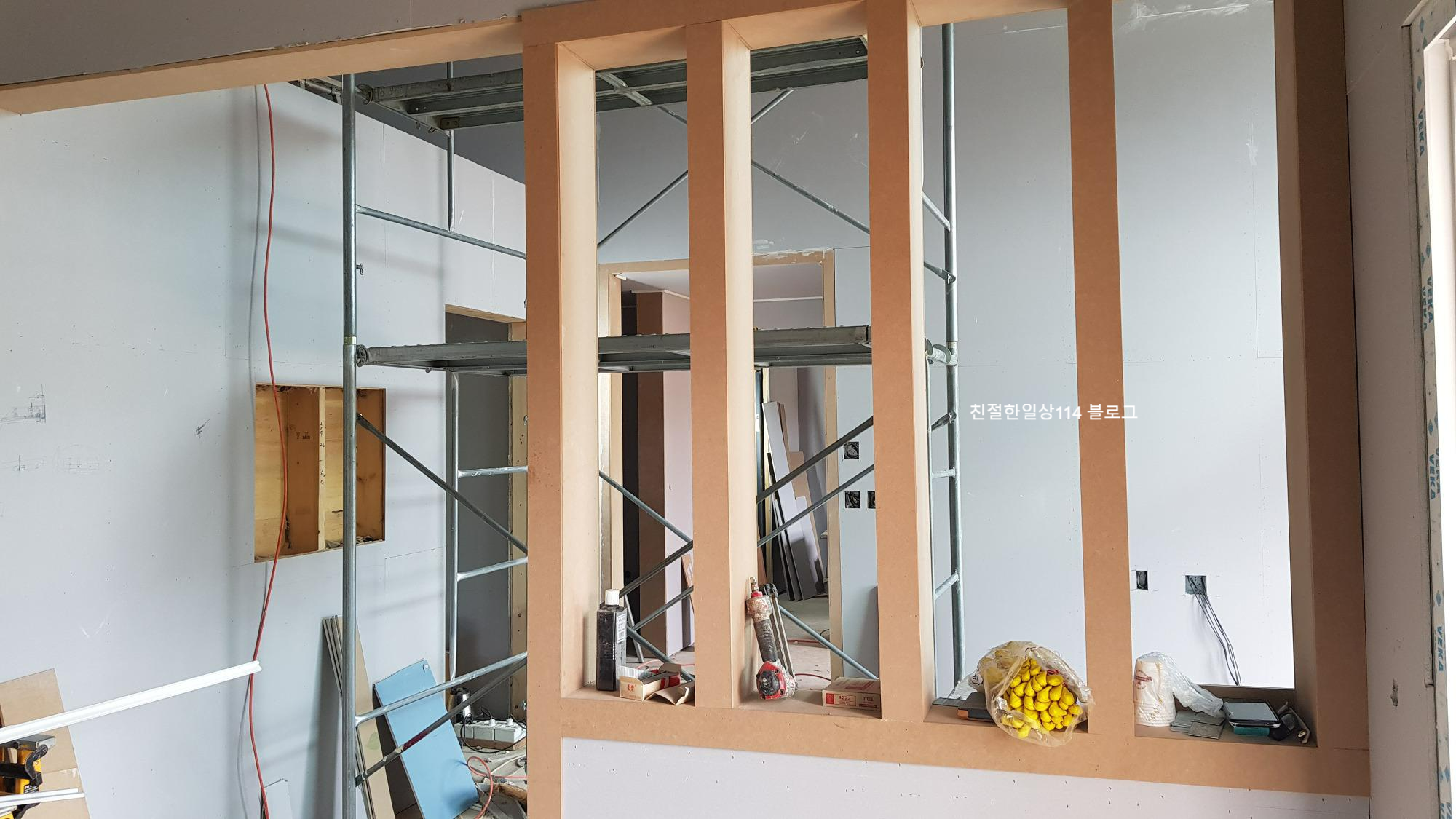 거실과 다이닝룸을 답답하지 않으면서 공간 구분을 해주는 가벽이다. 가벽 디자인도 상당히 많은 고민을 했었는데 칸을 조금 여유있게 하고 기둥 선을 굵게 두는 것으로 했다. 여기에도 거실벽 수납칸과 같은 짙은 갈색의 필름지를 입힐 예정이다.